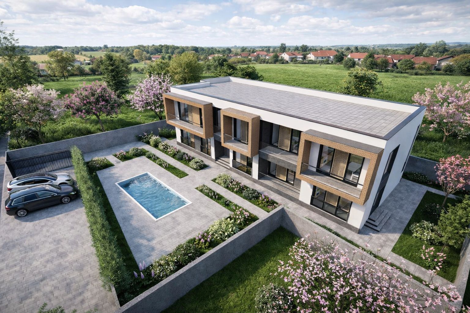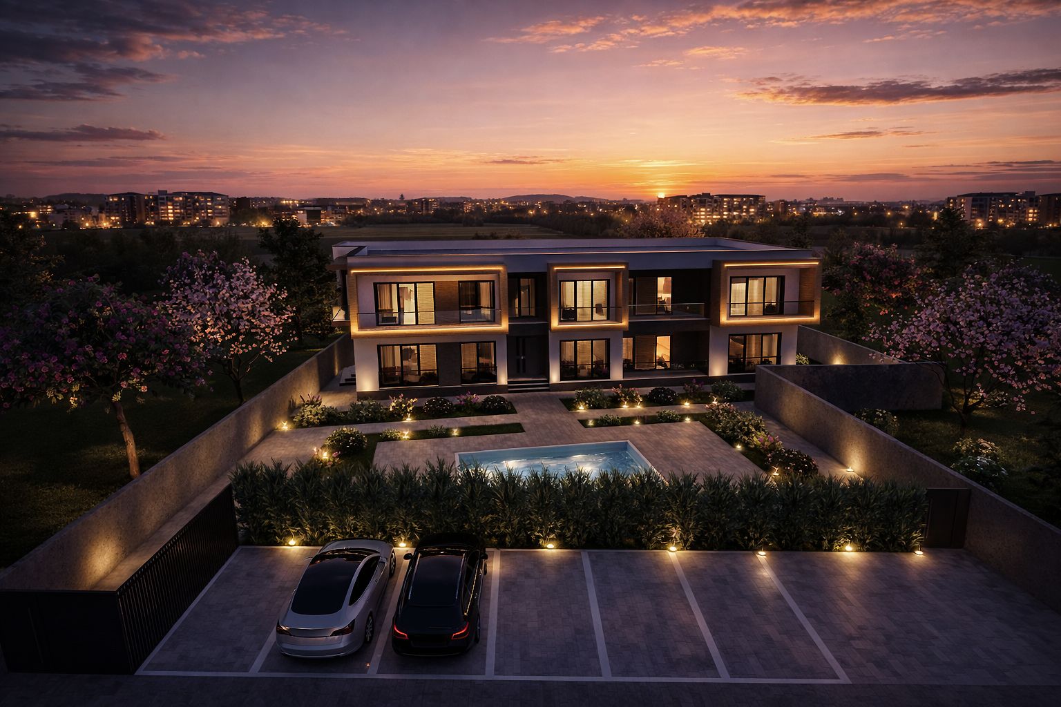 Accesul auto se realizează direct din strada Salcâmilor, iar spațiile de parcare sunt integrate coerent în ansamblu, fără a perturba zona de relaxare a complexului.
