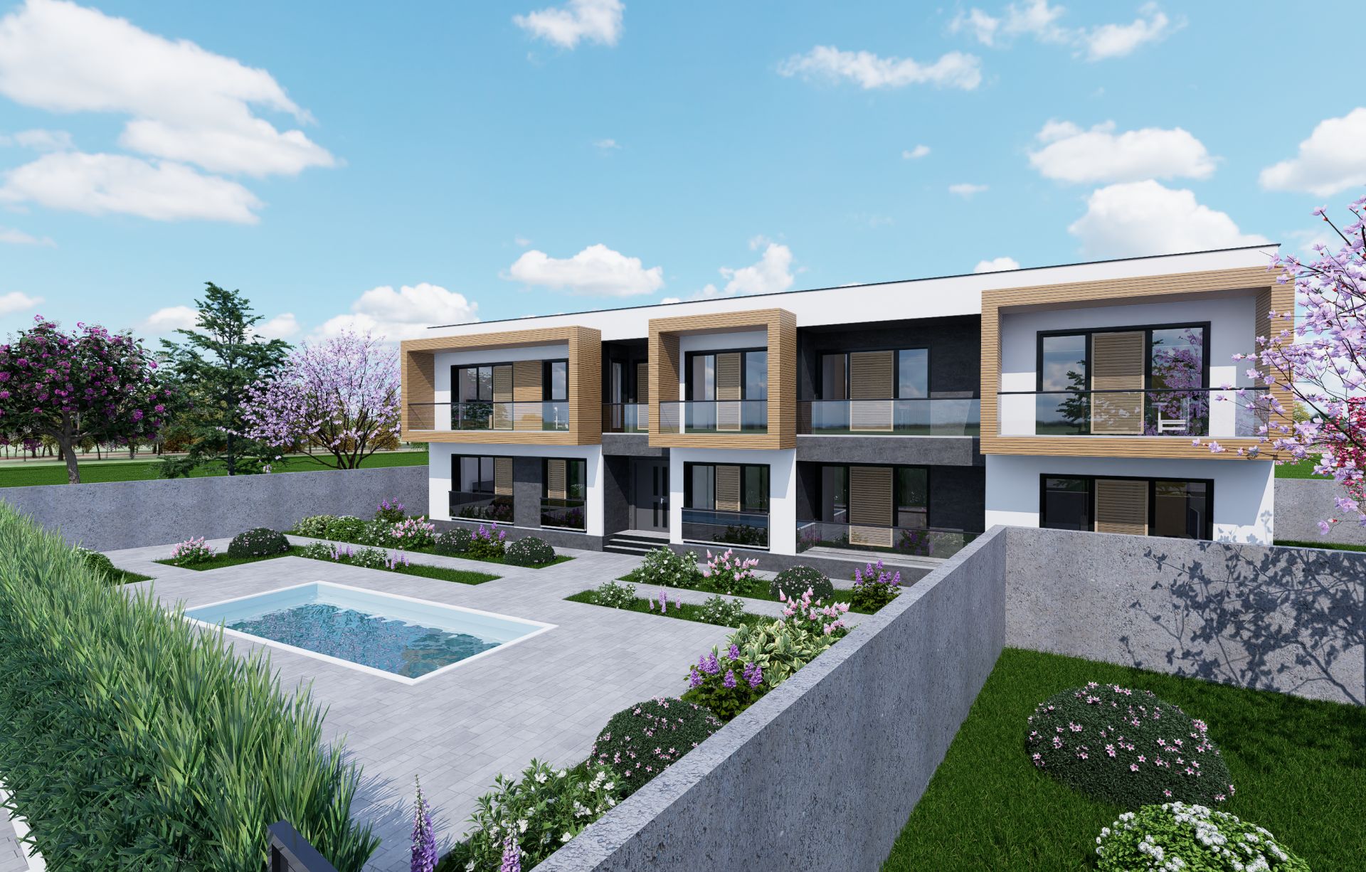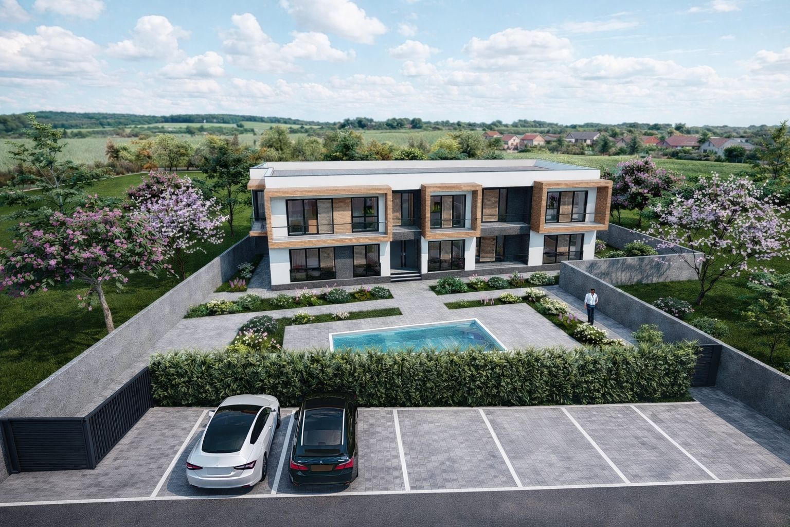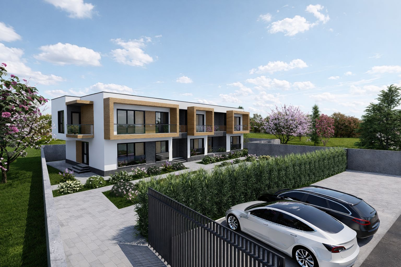 Fațada principală se remarcă printr-un joc de texturi și volume, obținut prin decalarea teraselor ieșite în consolă și alternanța materialelor de finisaj. Inserțiile de panouri tip lambriu din lemn, în contrast cu tencuiala decorativă gri antracit, conferă dinamism și eleganță fațadelor, accentuând caracterul contemporan al ansamblului.