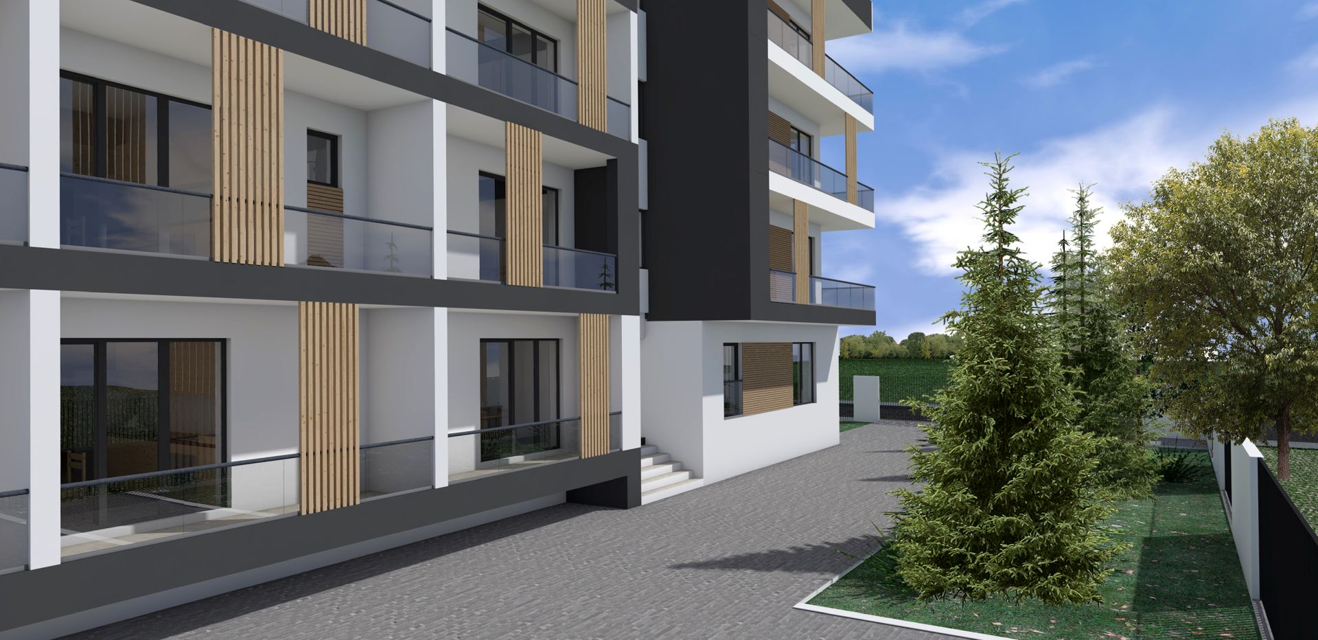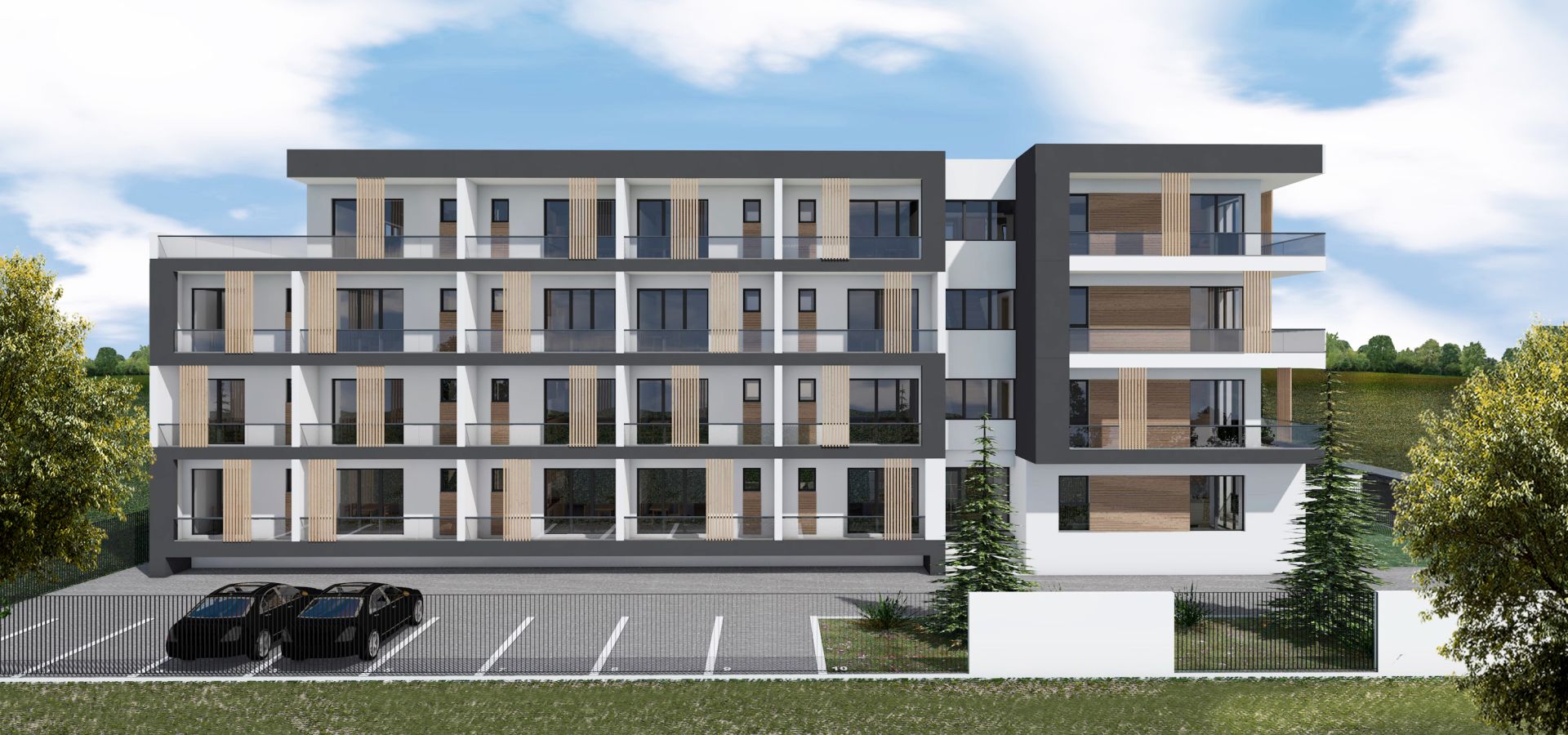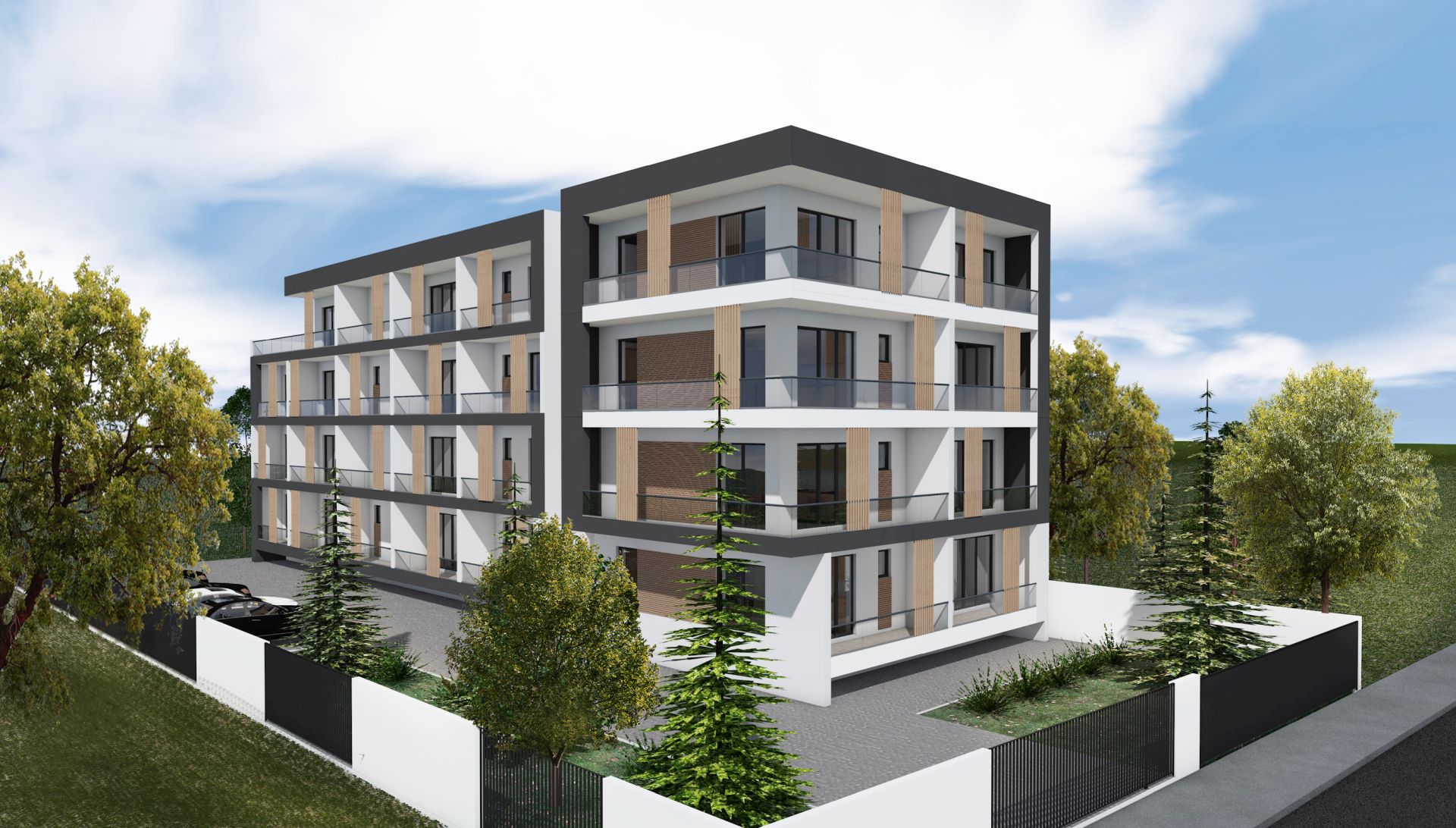 Fațadele imobilului sunt tratate într-un joc elegant de contrast alb–gri, care subliniază claritatea volumelor și expresia contemporană a clădirii. Terasele ieșite în consolă sunt accentuate prin utilizarea tencuielii decorative gri, evidențiind ritmul fațadelor și dinamica volumetrică a ansamblului.