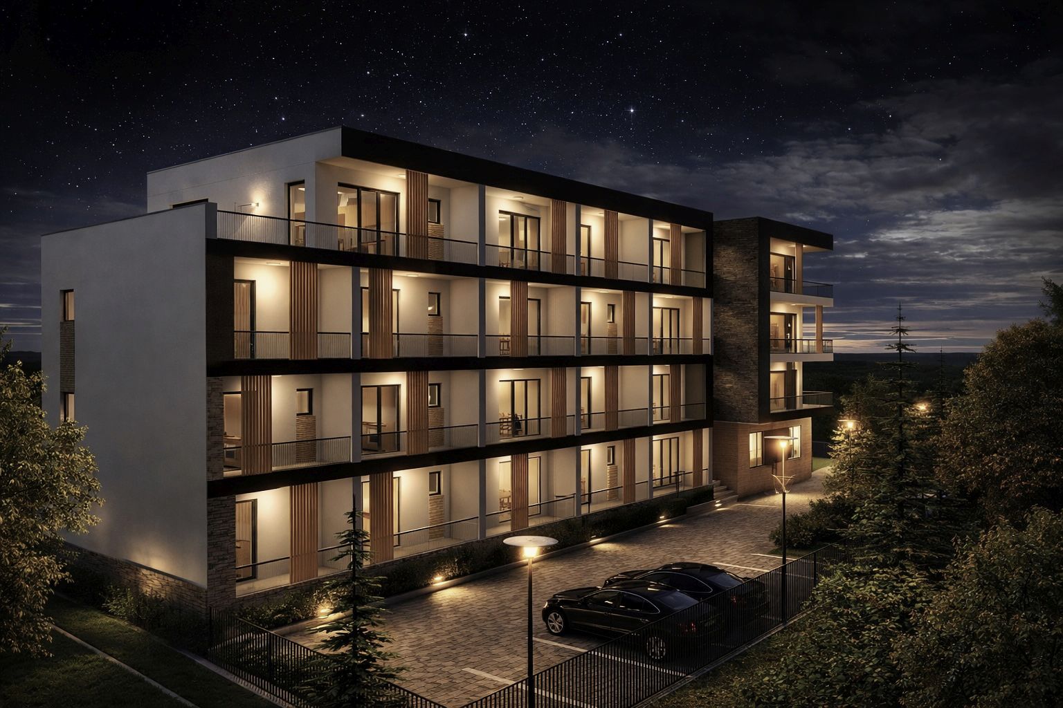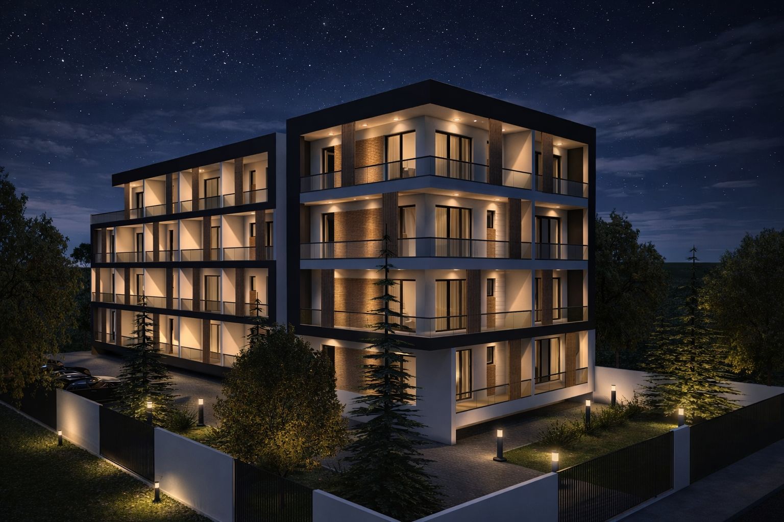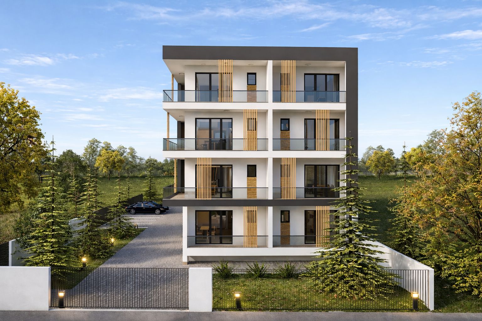 Fațadele imobilului sunt tratate într-un joc elegant de contrast alb–gri, care subliniază claritatea volumelor și expresia contemporană a clădirii. Terasele ieșite în consolă sunt accentuate prin utilizarea tencuielii decorative gri, evidențiind ritmul fațadelor și dinamica volumetrică a ansamblului.
