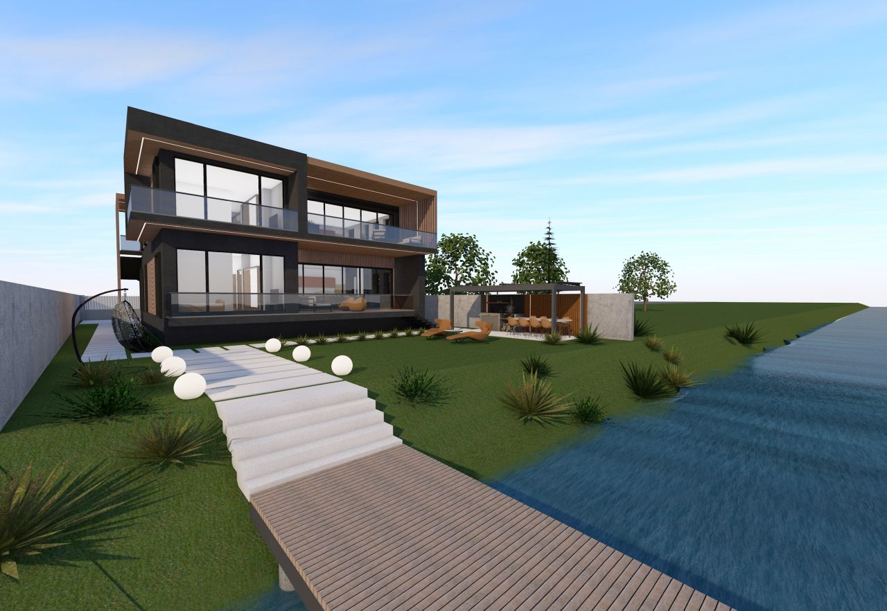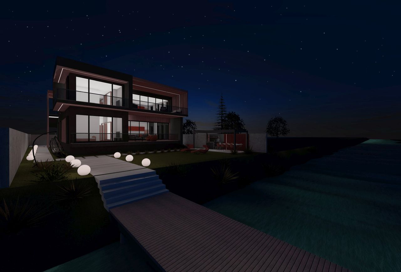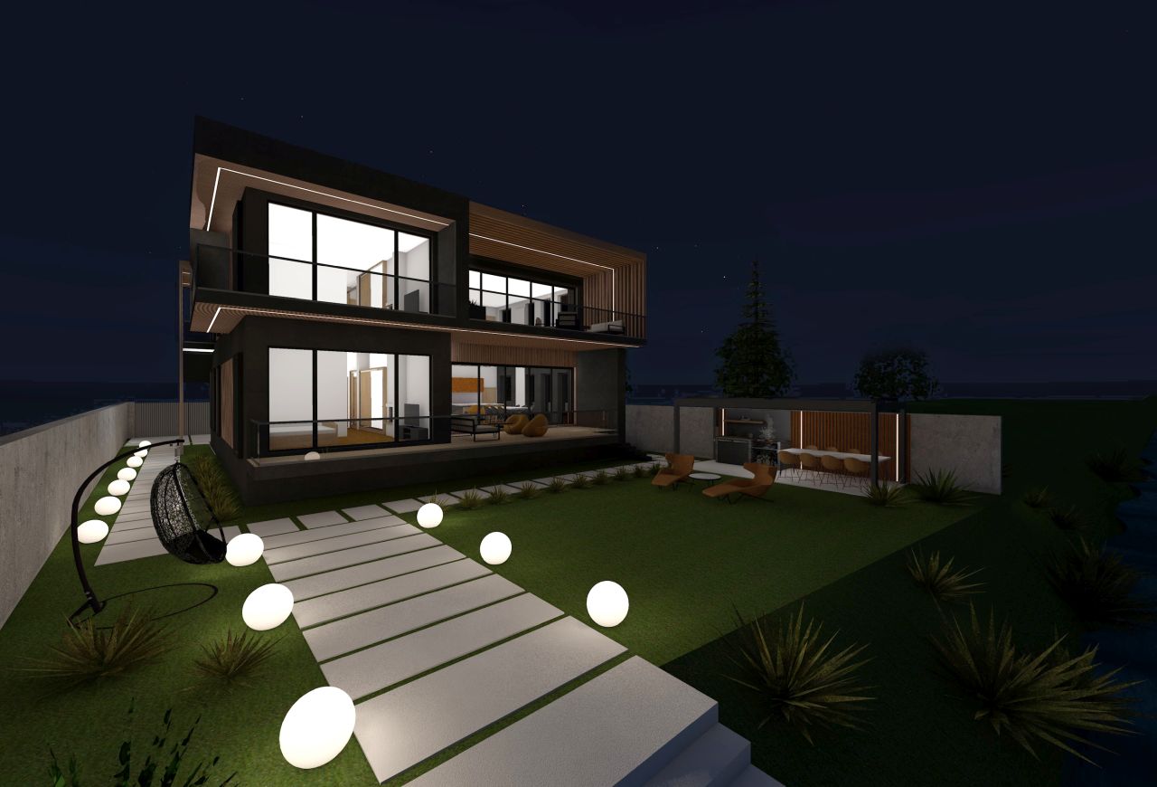 Profitând de vecinatetea cu lacul, am propus o volumetrie împărțită în două zone: zona de zi (bucătărie și living open space) cu terase ample cartre sud, către lac, iar zona de noapte către vest, având două module decalate în plan orizontal, pentru a putea permite crearea logiilor de la parter și etaj. În axul central al locuinței se distribuie toate încăperile, împărțind cele două zone.