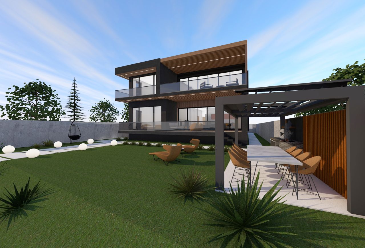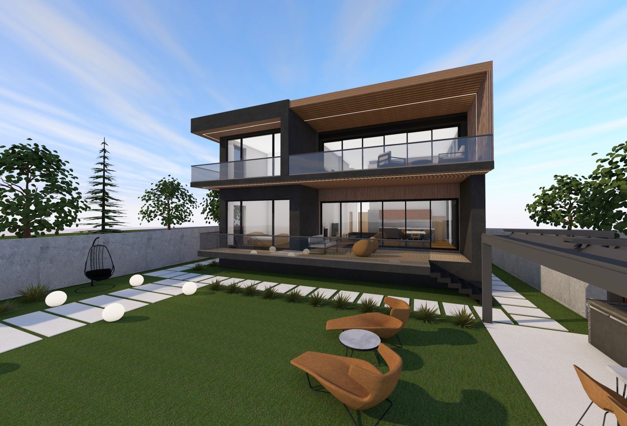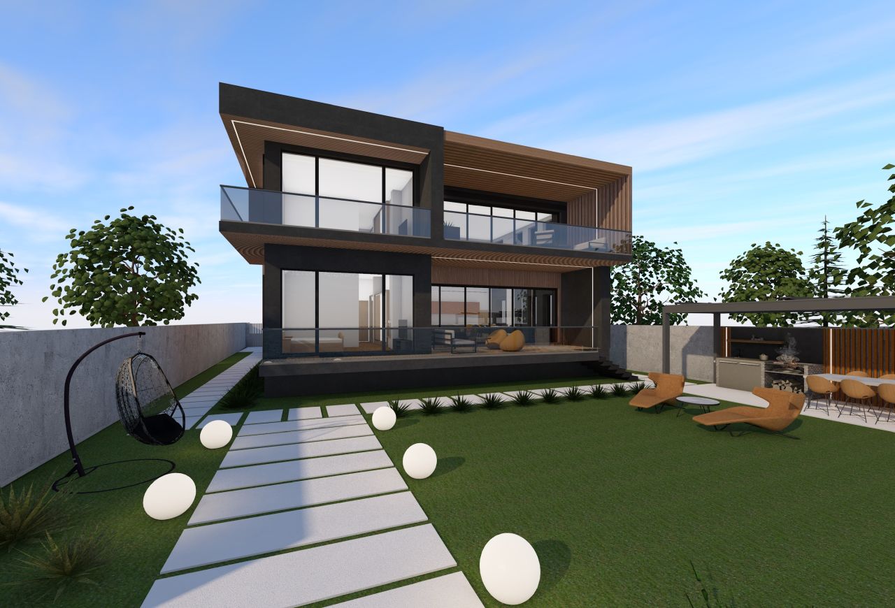 Profitând de vecinatetea cu lacul, am propus o volumetrie împărțită în două zone: zona de zi (bucătărie și living open space) cu terase ample cartre sud, către lac, iar zona de noapte către vest, având două module decalate în plan orizontal, pentru a putea permite crearea logiilor de la parter și etaj. În axul central al locuinței se distribuie toate încăperile, împărțind cele două zone.
