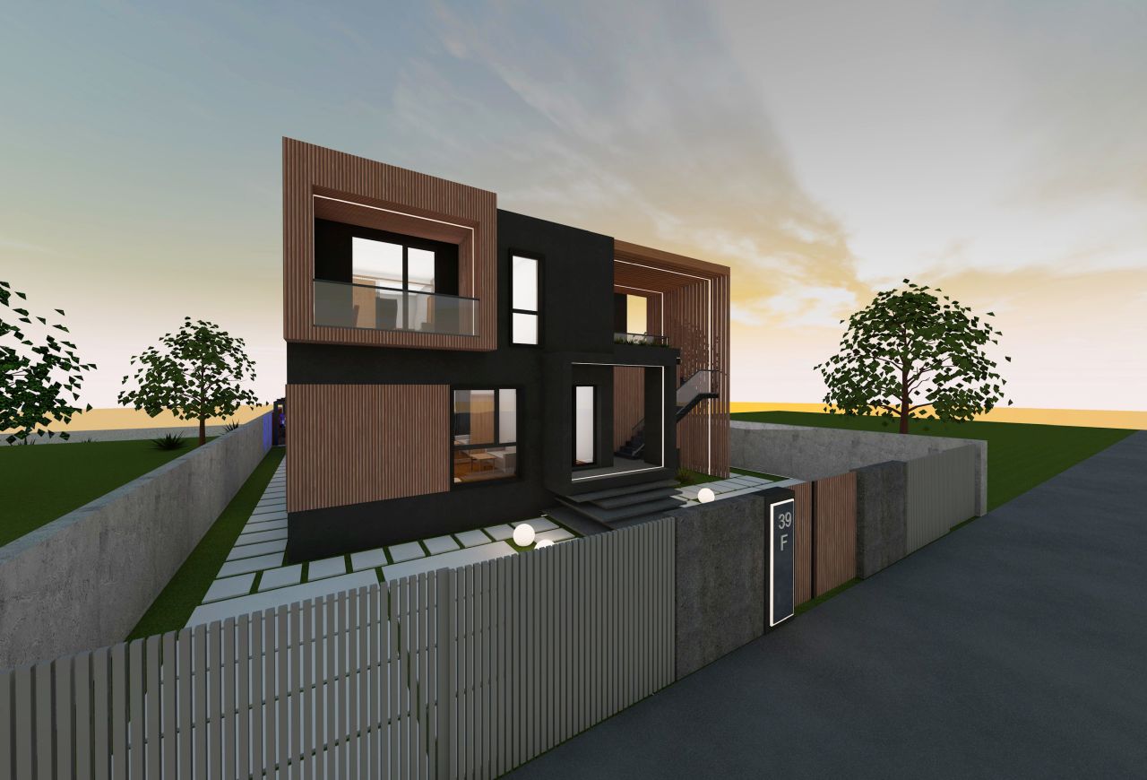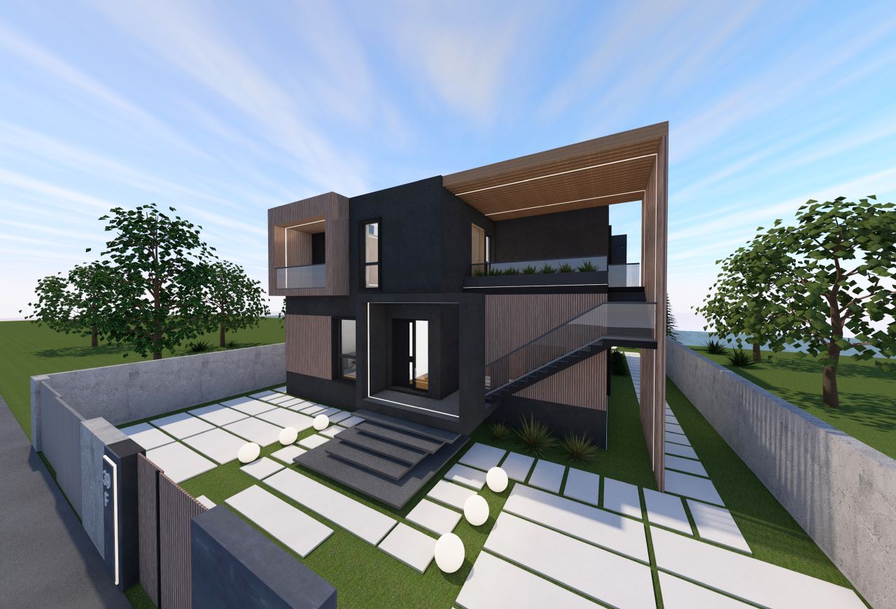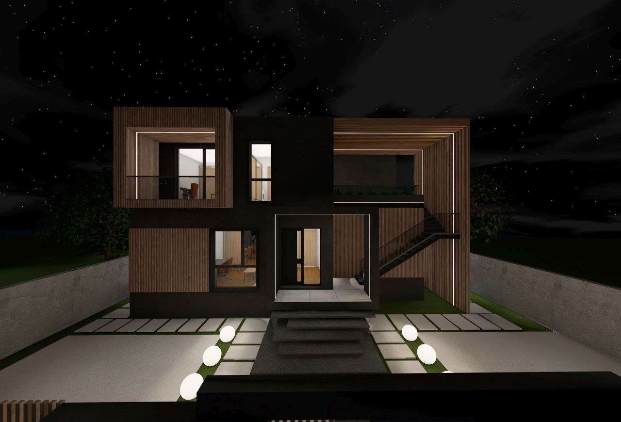 Locuința de la etaj este accesată printr-o scară metalică exterioară amplasată în lateralul imobilului, in dreapta accesului principal, delimitată de panouri de riflaje verticale din lemn care se continuă și la nivelul terasei. Din punct de vedere al materialității, am utilizat o tencuială decorativă gri, cu aspect betonat, la care am intervenit cu panouri compozite din lemn la nivelul teraselor și ferestrelor pentru a oferi contrast la nivelul fatadelor si pentru a le pune in valoare mai bine la nivel exterior.