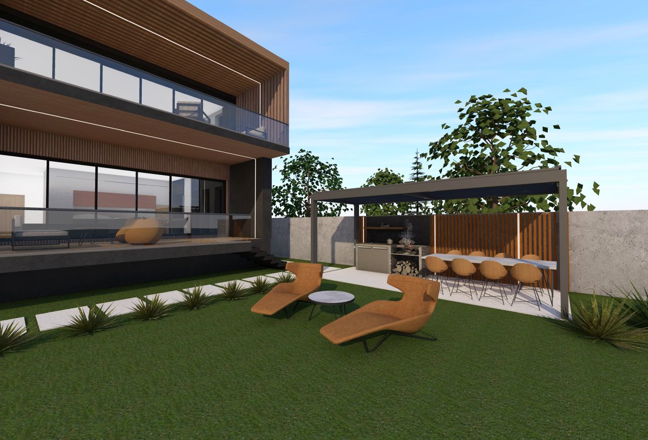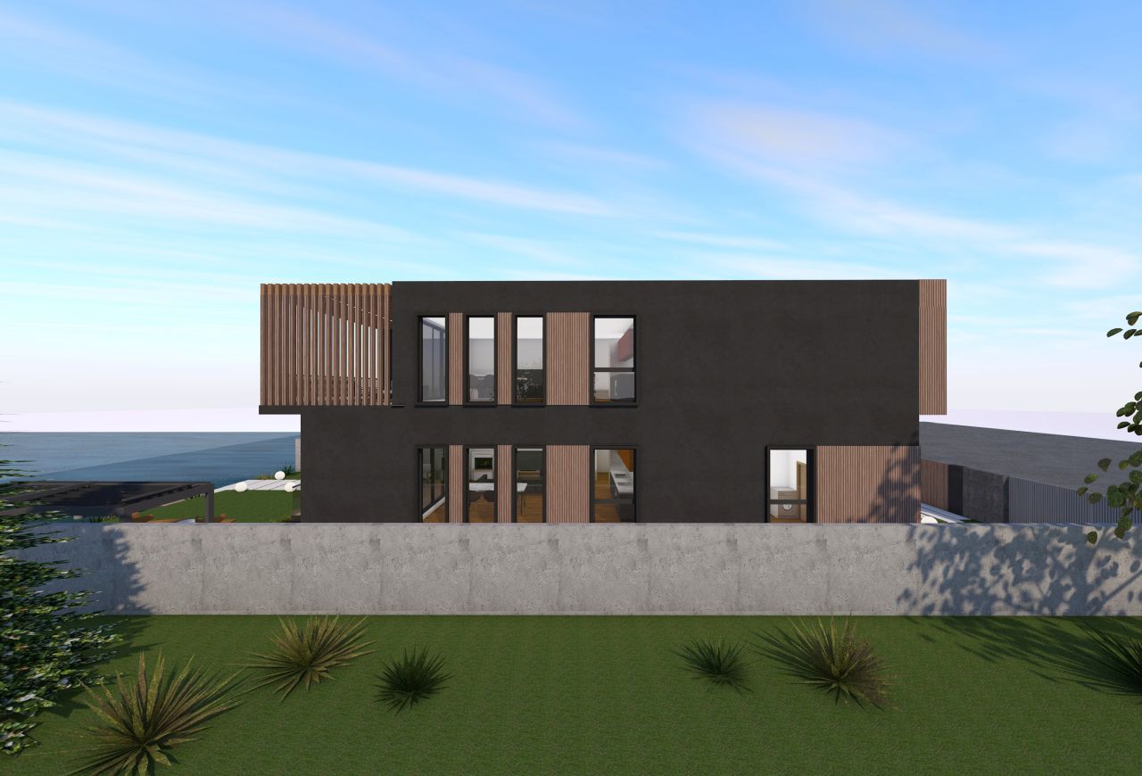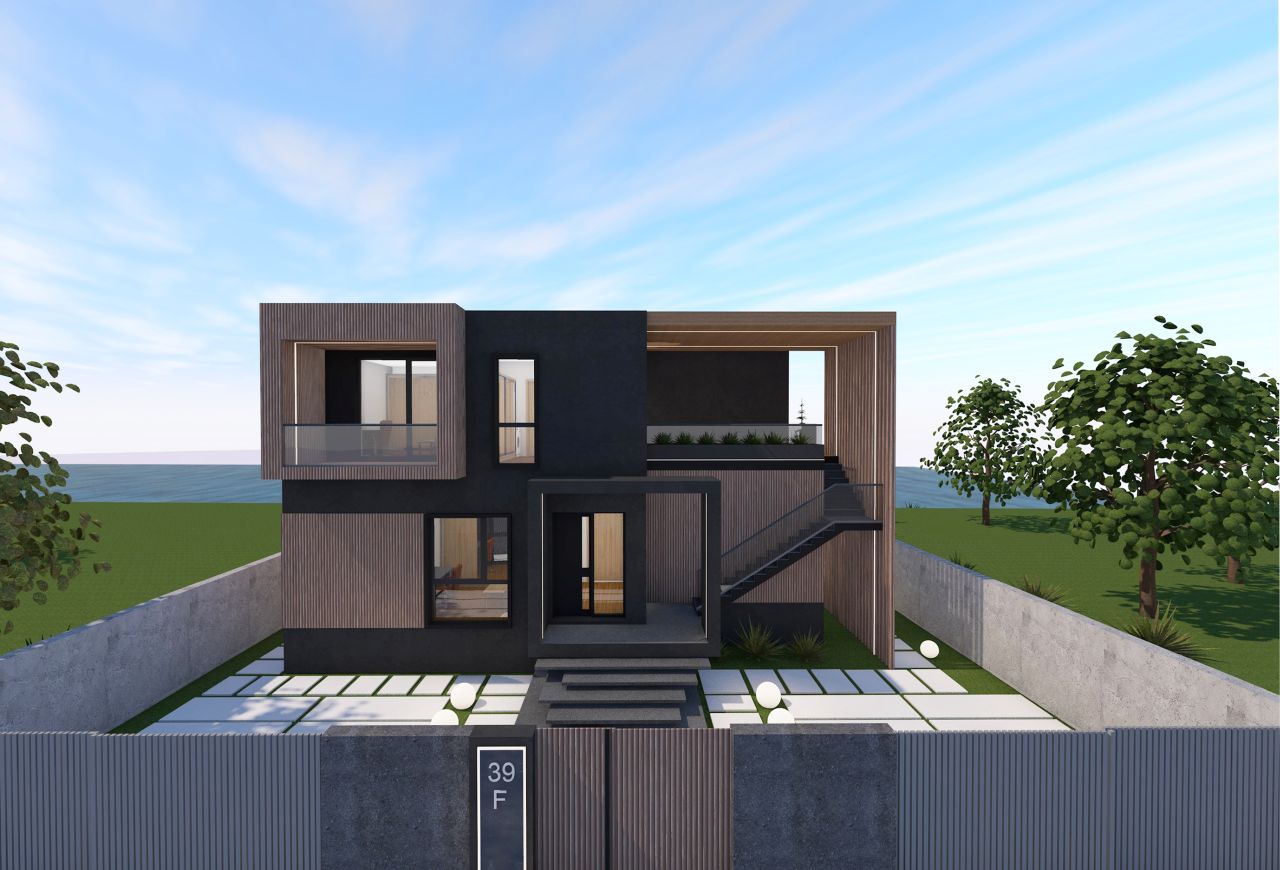 Locuința de la etaj este accesată printr-o scară metalică exterioară amplasată în lateralul imobilului, in dreapta accesului principal, delimitată de panouri de riflaje verticale din lemn care se continuă și la nivelul terasei. Din punct de vedere al materialității, am utilizat o tencuială decorativă gri, cu aspect betonat, la care am intervenit cu panouri compozite din lemn la nivelul teraselor și ferestrelor pentru a oferi contrast la nivelul fatadelor si pentru a le pune in valoare mai bine la nivel exterior.