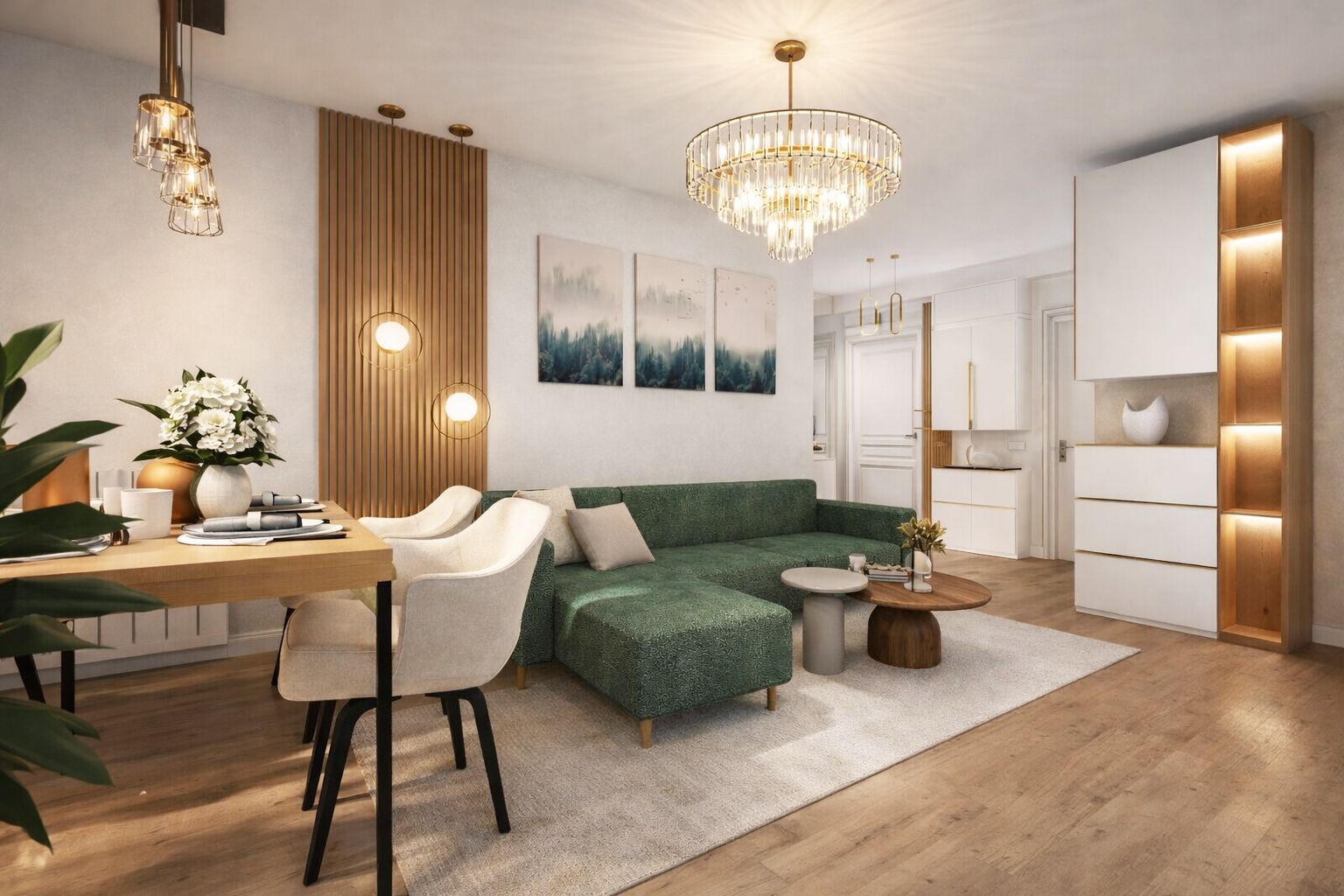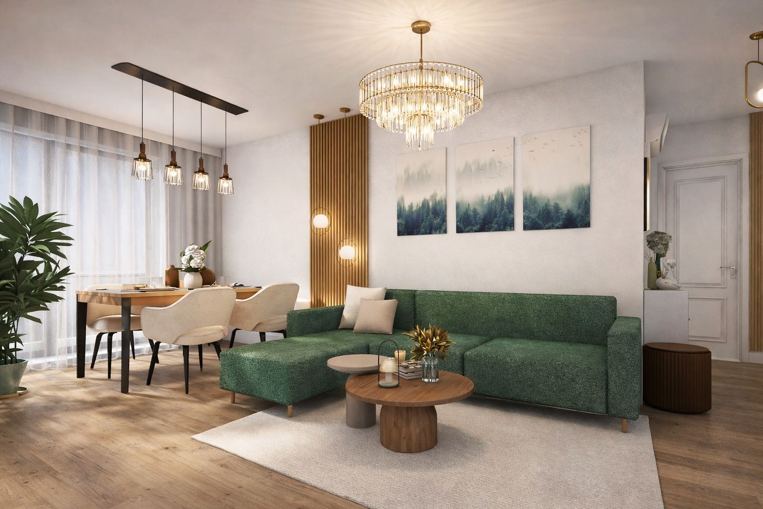 Contrastul și accentul amenajării este dat de canapelele în nuanțe oliv din living room și birou, de plante, de textilele și obiectele de decor care oferă un contrast subtil și conferă senzația de comuniune cu natura, de serenitate și liniște.
