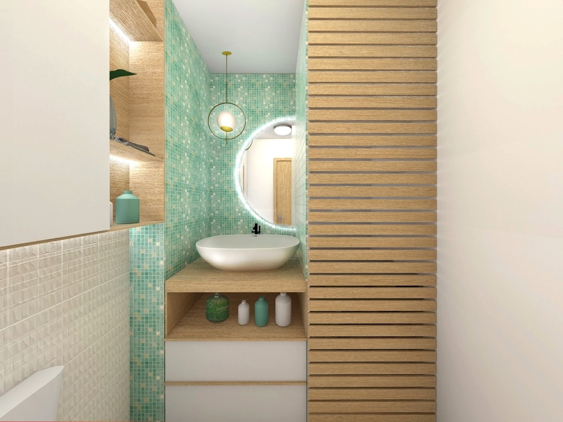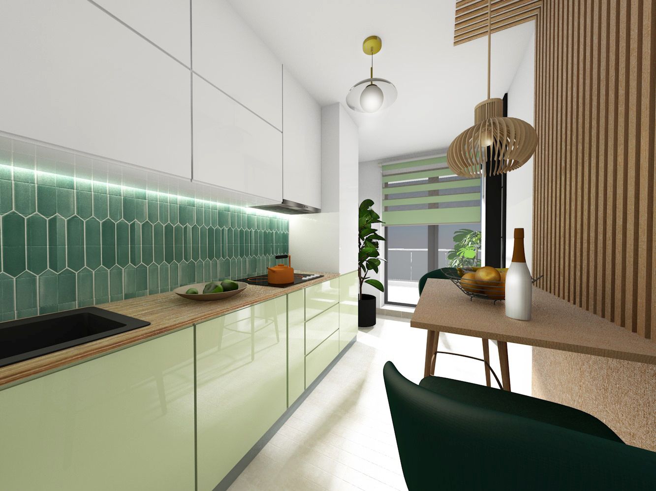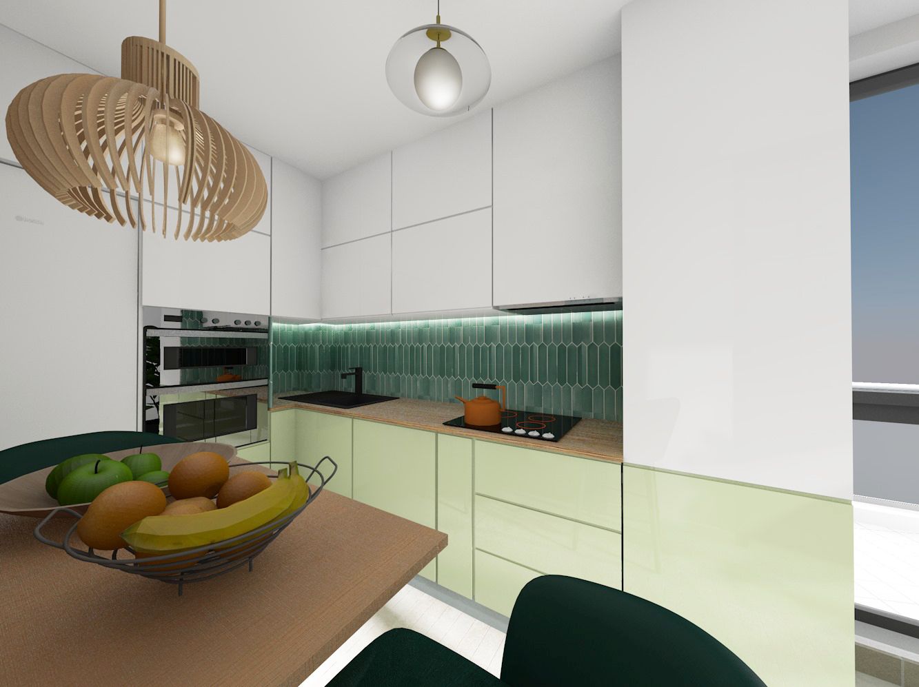 Bucătăria este amenajată sub formă de „L” și cuprinde partea funcțională propriu-zisă, precum și locul de luat masacareeste tratat cu riflaje în nuanțe de lemn de stejar. Bucătăria merge tot în nuanțe de verde-oliv deschis, pal, la partea inferioară, precum și în zona contrablatului în care am propus inserții de plăci de faianță verde închis.