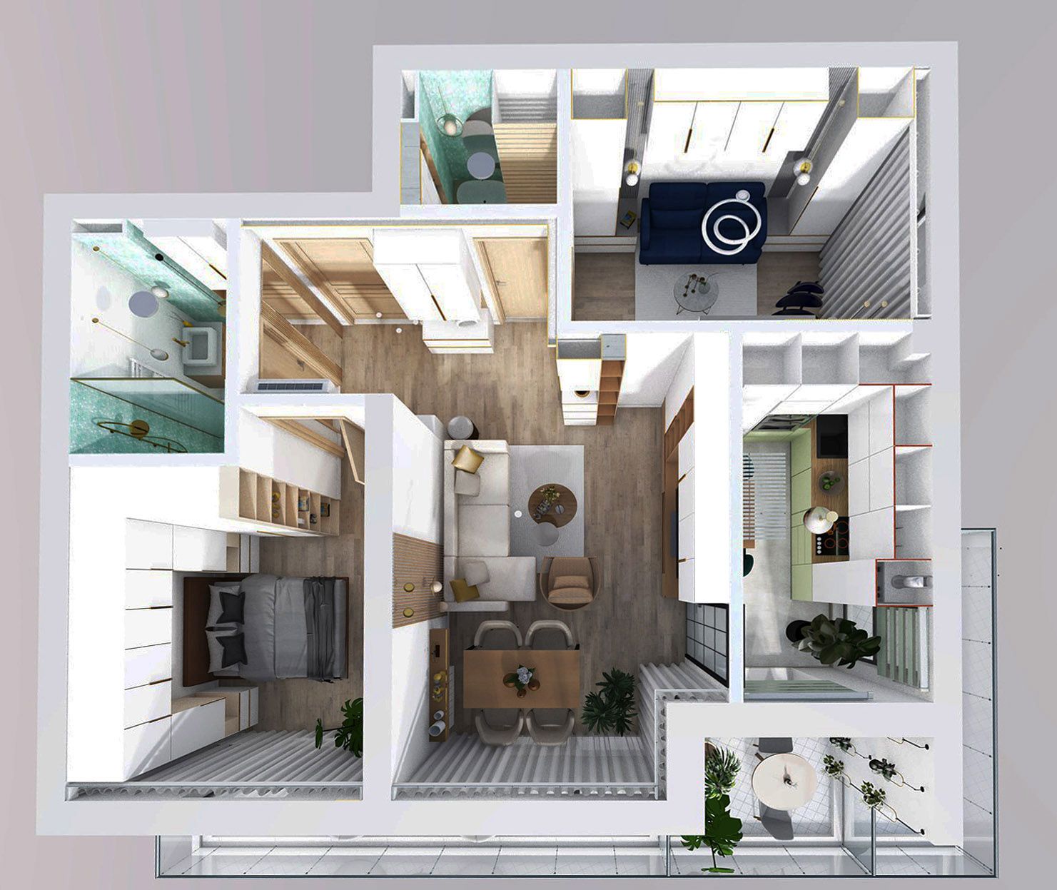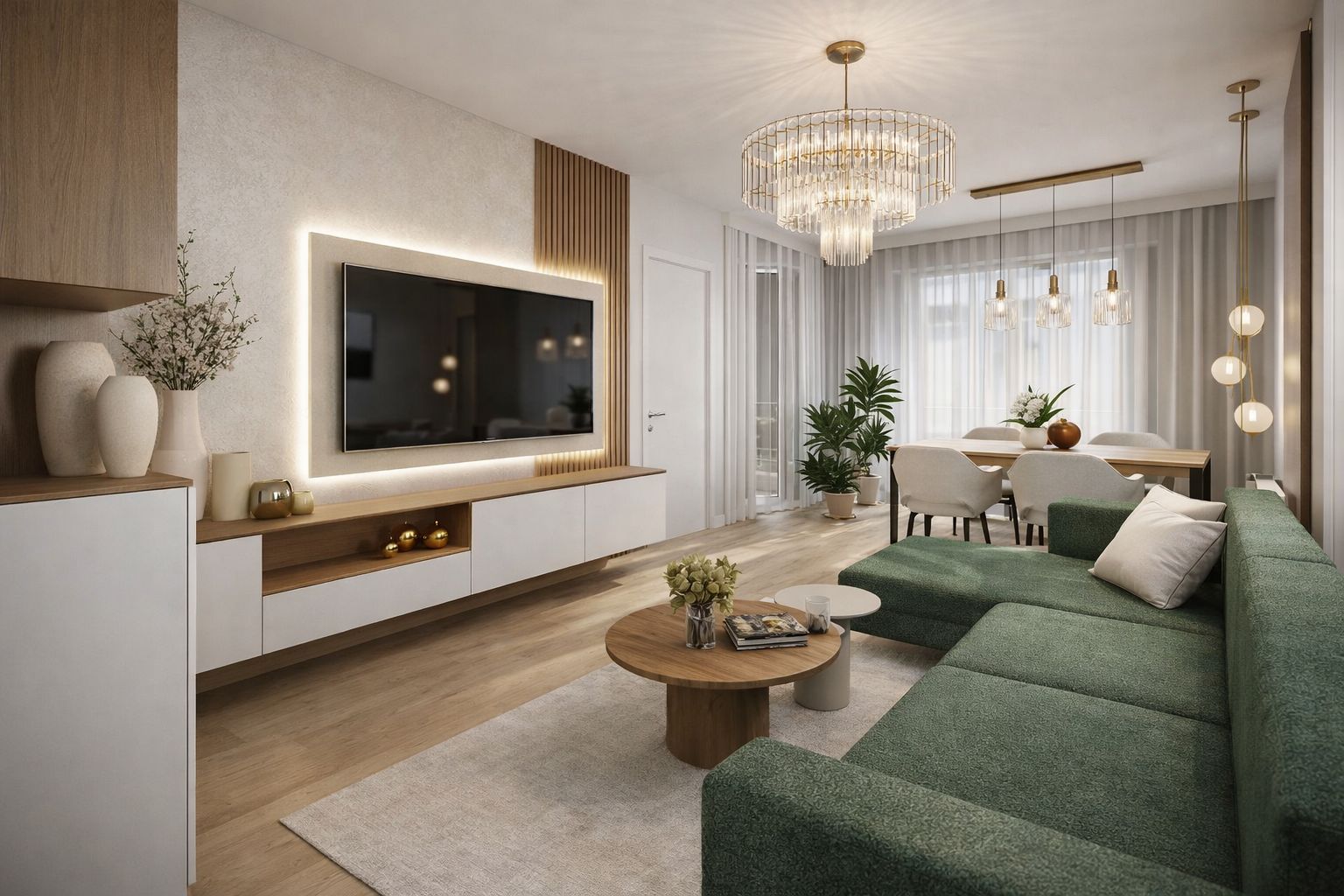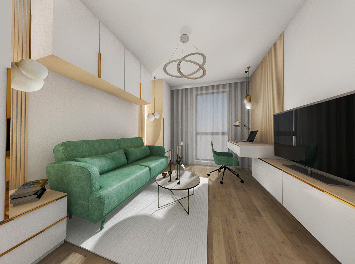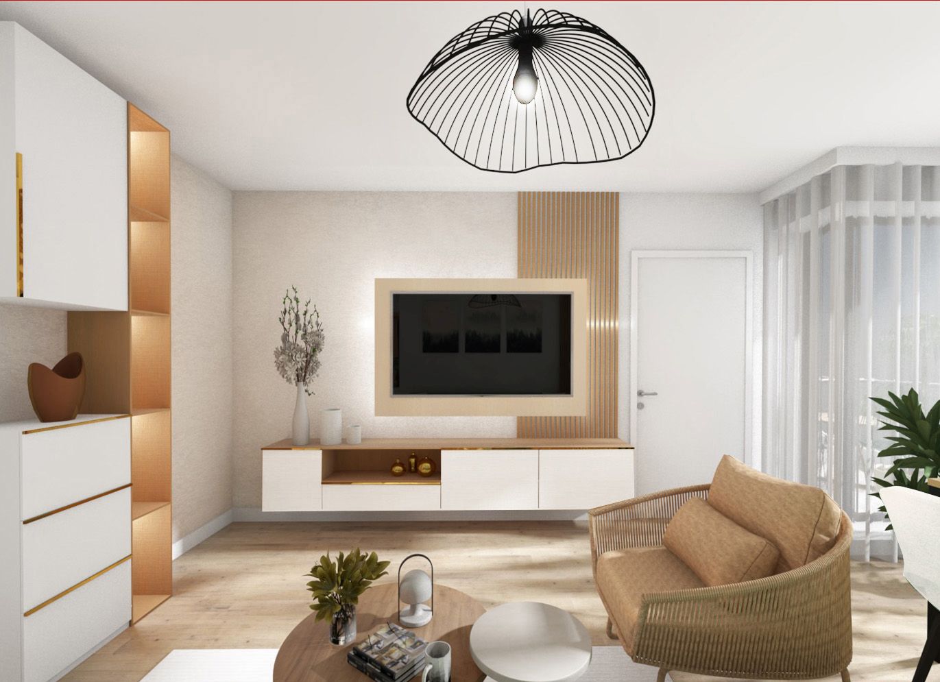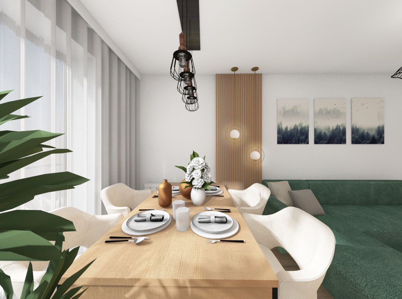 Living-roomul este piesă principală a locuinței și cea de relaxare, în care am integrat o comodă TV și o bibliotecă cu rafturi vizibile pe peretele adiacent, pentru a nu încărca prea mult spațiul. În apropierea ferestrei am poziționat masa de dining, care primește destul de multă lumină în colțul din apropierea terasei. Pentru a nu încărca cu decor prea mult încăperile, am recurs la draperii albe, simple, care măresc vizual și luminează spațiile.