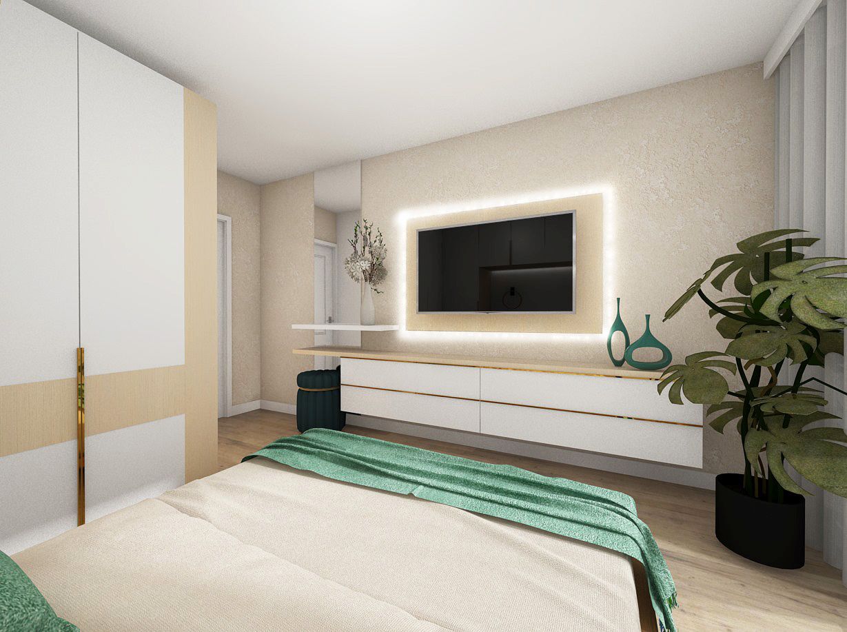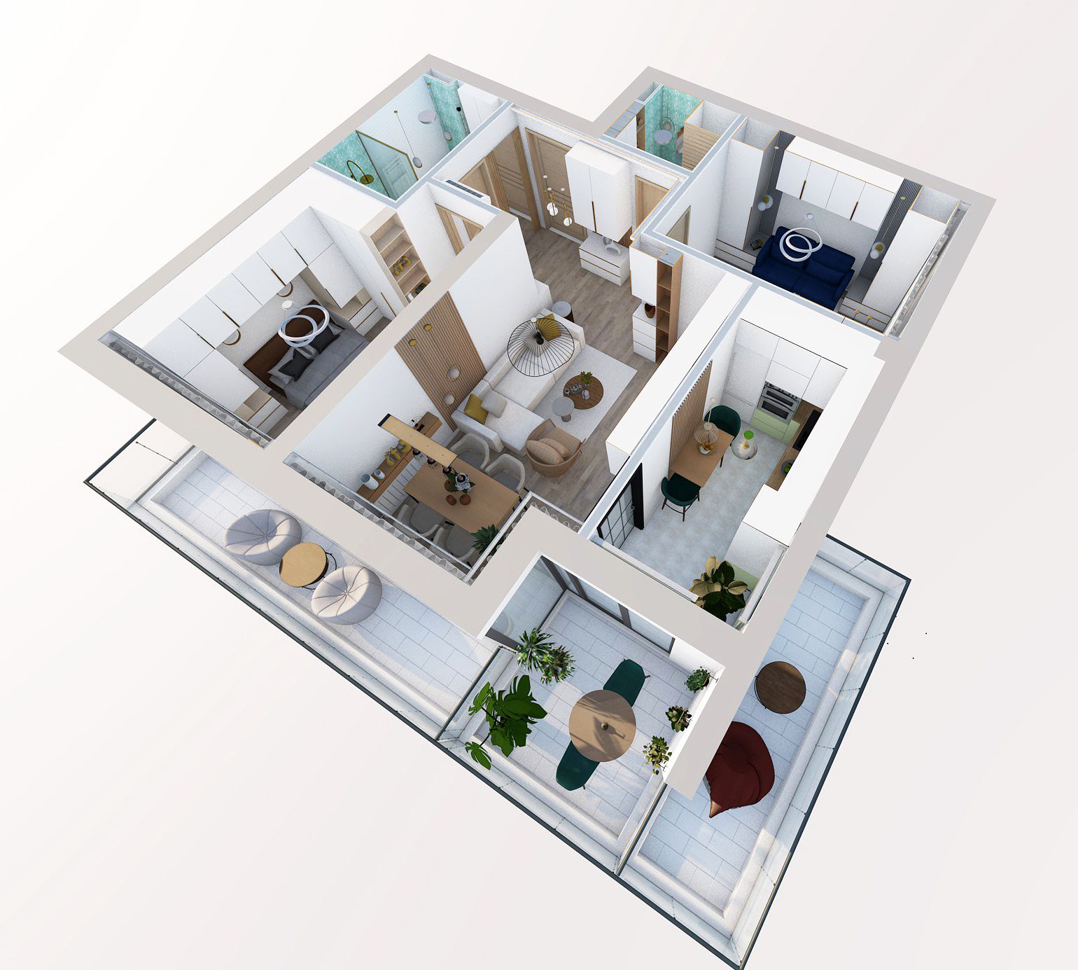 În cadrul acestei amenajări, am urmărit crearea unei atmosfere de relaxare, deschise, simple prin alegerea materialelor și a obiectelor ce compun încăperile, mizând mai mult pe tonalități neutre și cu un accent de culoare oliv, pe care îl regăsim în elementele de mobilier ce conturează amenajarea. Apartamentul este compus dintr-un living, bucătărie, dormitor matrimonial, birou, două băi precum și două terase: una închisă cu sticlă, accesibilă din bucătărie și living și celelalte deschise, accesibile din dormitoare.