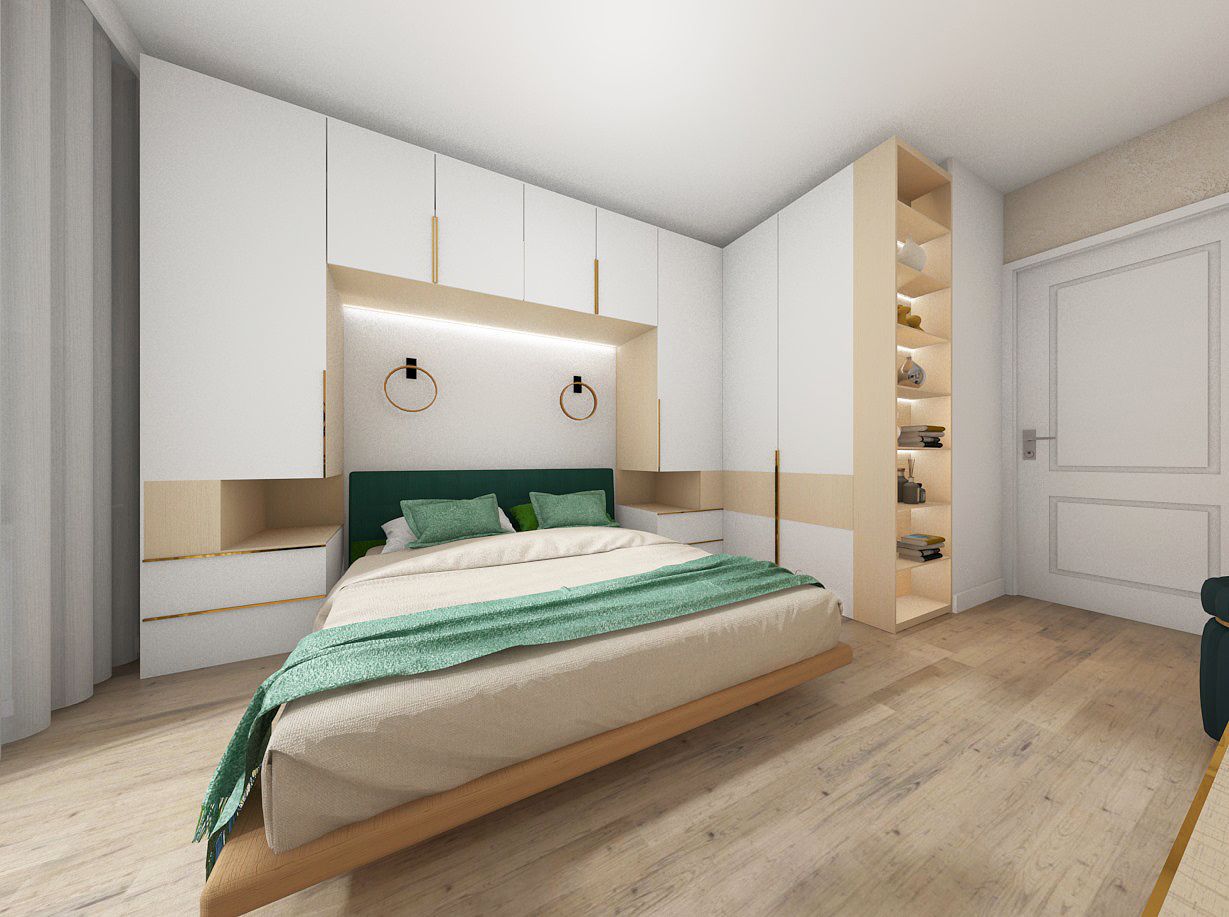 Suprafatele au fost destul de reduse, astfel încât a trebuit să optimizez foarte bine aranjarea pieselor și să eficientizez fiecare spațiu. O dorință a proprietarei a fost aceea de a avea mai multe spații de depozitare, așadar, în dormitorul matrimonial precum și în birou, am propus un ansamblu coerent de dulapuricarefac uz și de spațiul de deasupra patului/canapelei, creând o piesă de mobilier unitară, în care am propus inserții de lemn, pentru a crea un contrast mai subtil și pentru a conferi mai multă căldură spațiului.