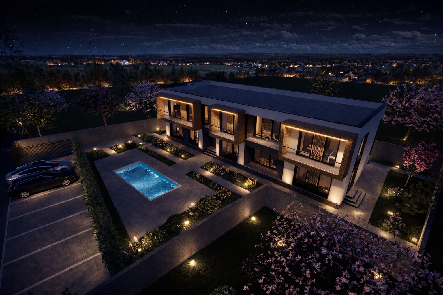 Accesul auto se realizează direct din strada Salcâmilor, iar spațiile de parcare sunt integrate coerent în ansamblu, fără a perturba zona de relaxare a complexului.
