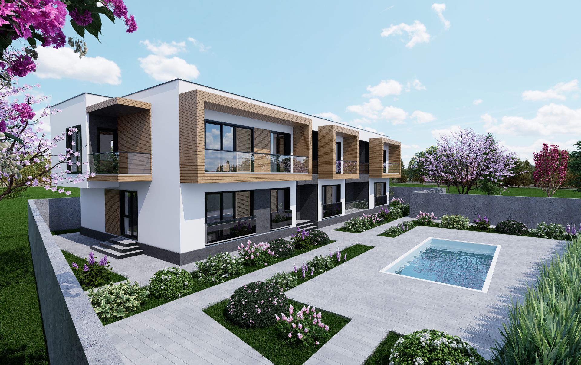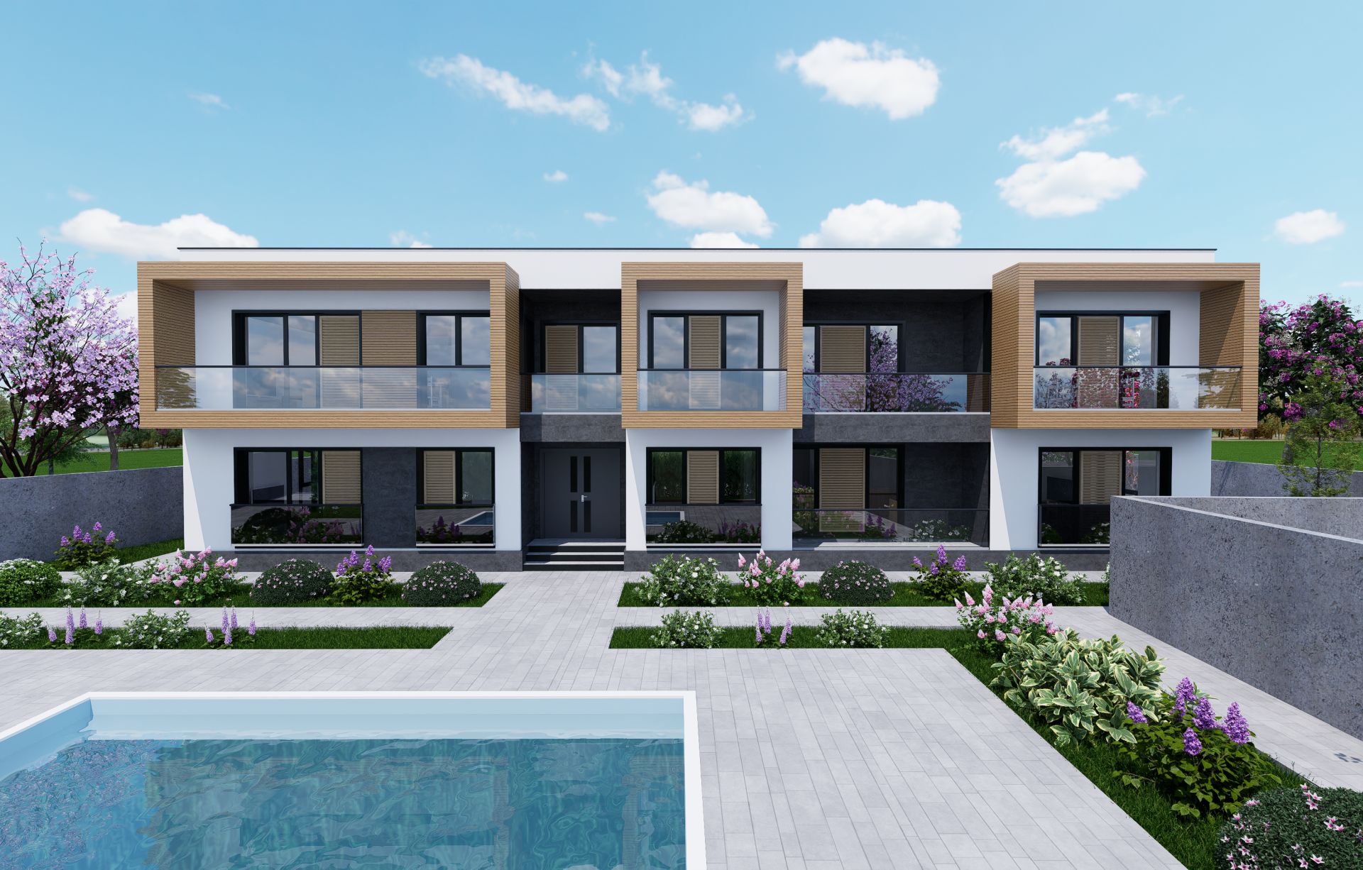 Fațada principală se remarcă printr-un joc de texturi și volume, obținut prin decalarea teraselor ieșite în consolă și alternanța materialelor de finisaj. Inserțiile de panouri tip lambriu din lemn, în contrast cu tencuiala decorativă gri antracit, conferă dinamism și eleganță fațadelor, accentuând caracterul contemporan al ansamblului.