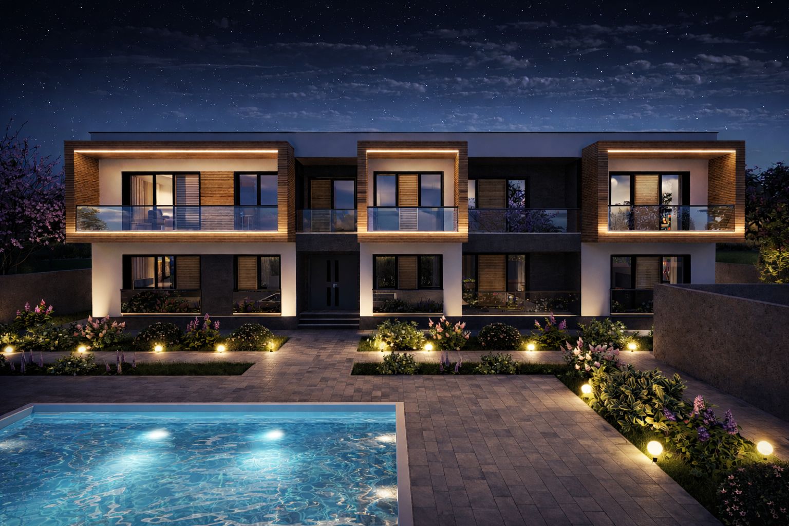 Zona exterioară este concepută ca un element esențial al proiectului, incluzând o piscină exterioară ca punct central de atracție, în jurul căreia se dezvoltă amenajarea peisagistică. Spațiile verzi, zonele de circulație și cele de relaxare sunt atent configurate pentru a crea o atmosferă plăcută, destinată utilizării pe tot parcursul sezonului estival.