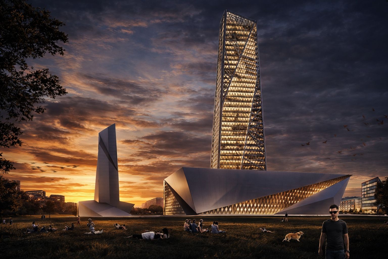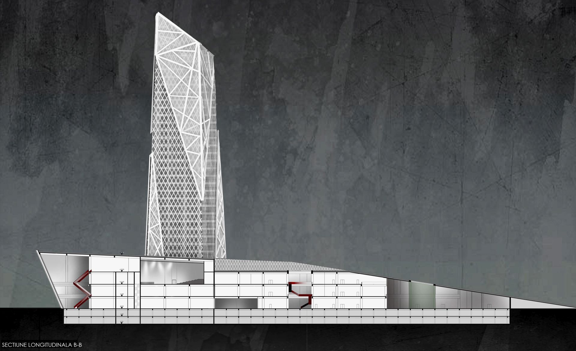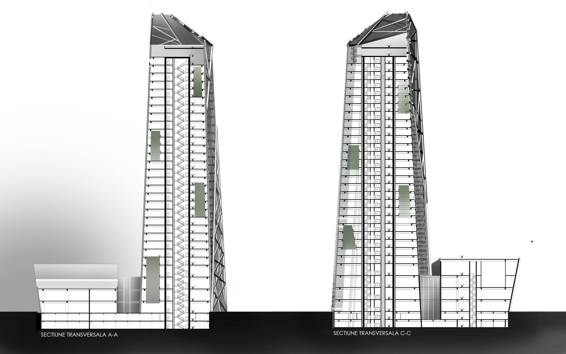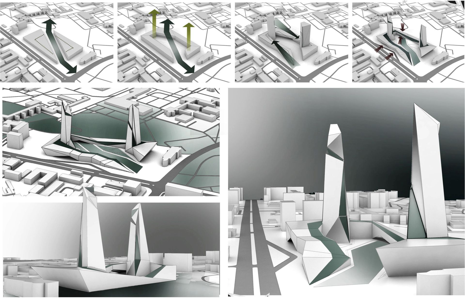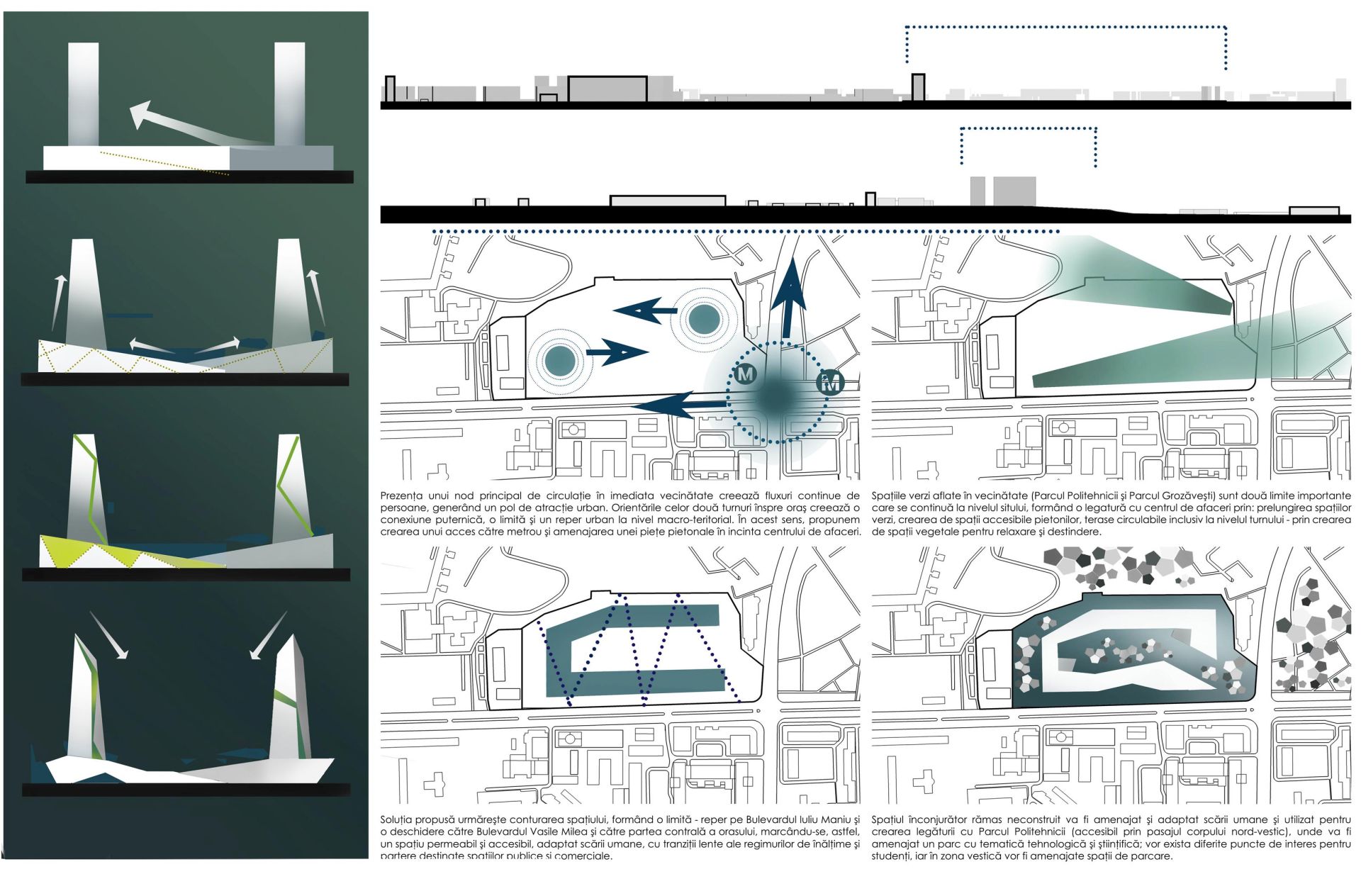 Soluția propusă urmărește conturarea spațiului liber, formând o limită-reper pe Bulevardul luliu Maniu și lăsând o deschidere către Bulevardul Vasile Milea și către partea centrală a orașului, marcându-se, astfel, un spațiu permeabil și accesibil, adaptat scării umane, având comunicare permamentă cu parterele destinate spațiilor publice și comerciale. Astfel, ideea s-a concretizat prin realizarea prelungirilor celor două parcuri din vecinătate, prin tranziții lente ale regimelor de înălțime, urmărindu-se un sens ascendent, de la bază către vârf, cu etaje care se retrag succesiv, dominând verticalitatea turnului, manifestându-se ca un simbol și un element iconic la nivel macroteritorial. Aceste prelungiri – extensii ale parcurilor la nivelul cladirilor creeaza terase circulabile si spatii accesibile pietonilor.