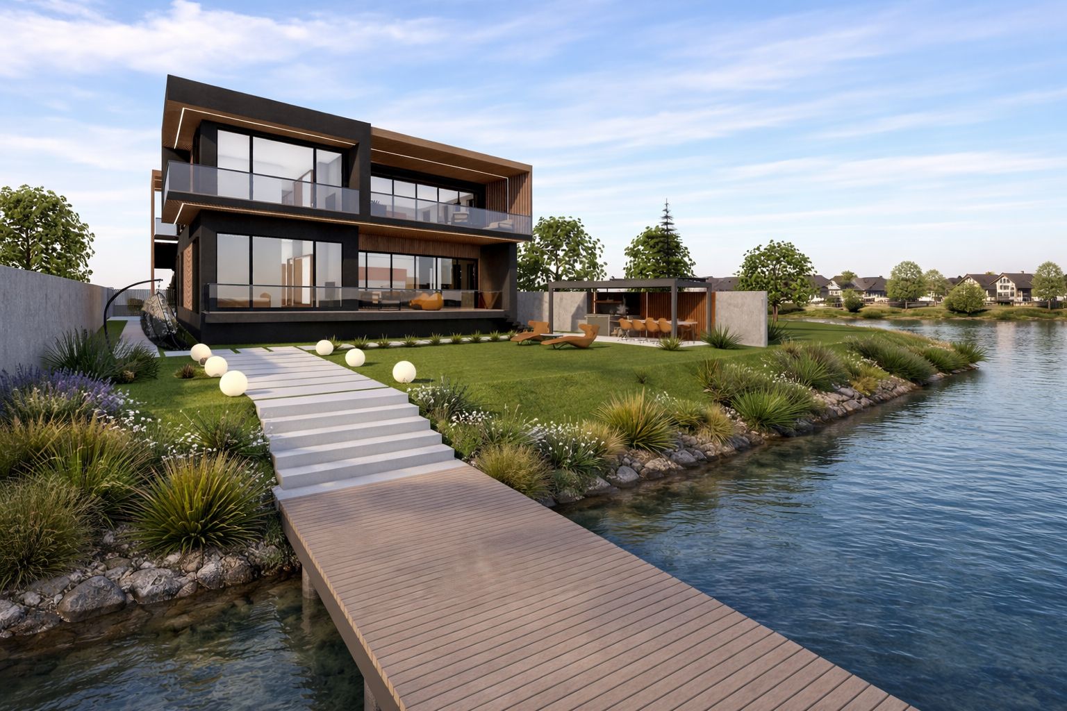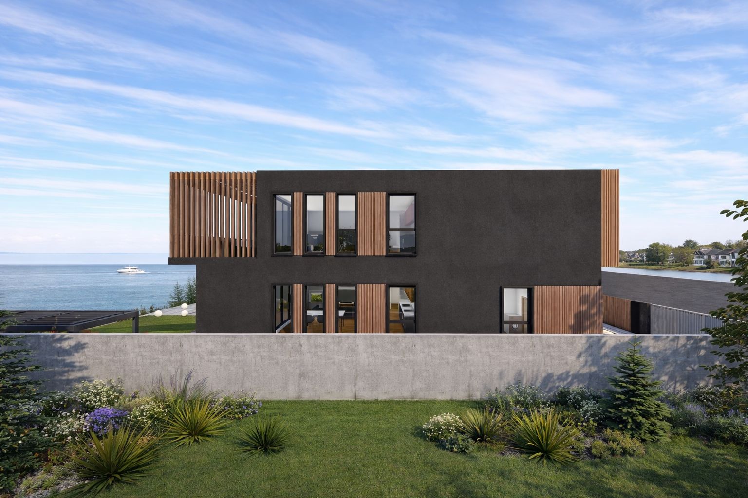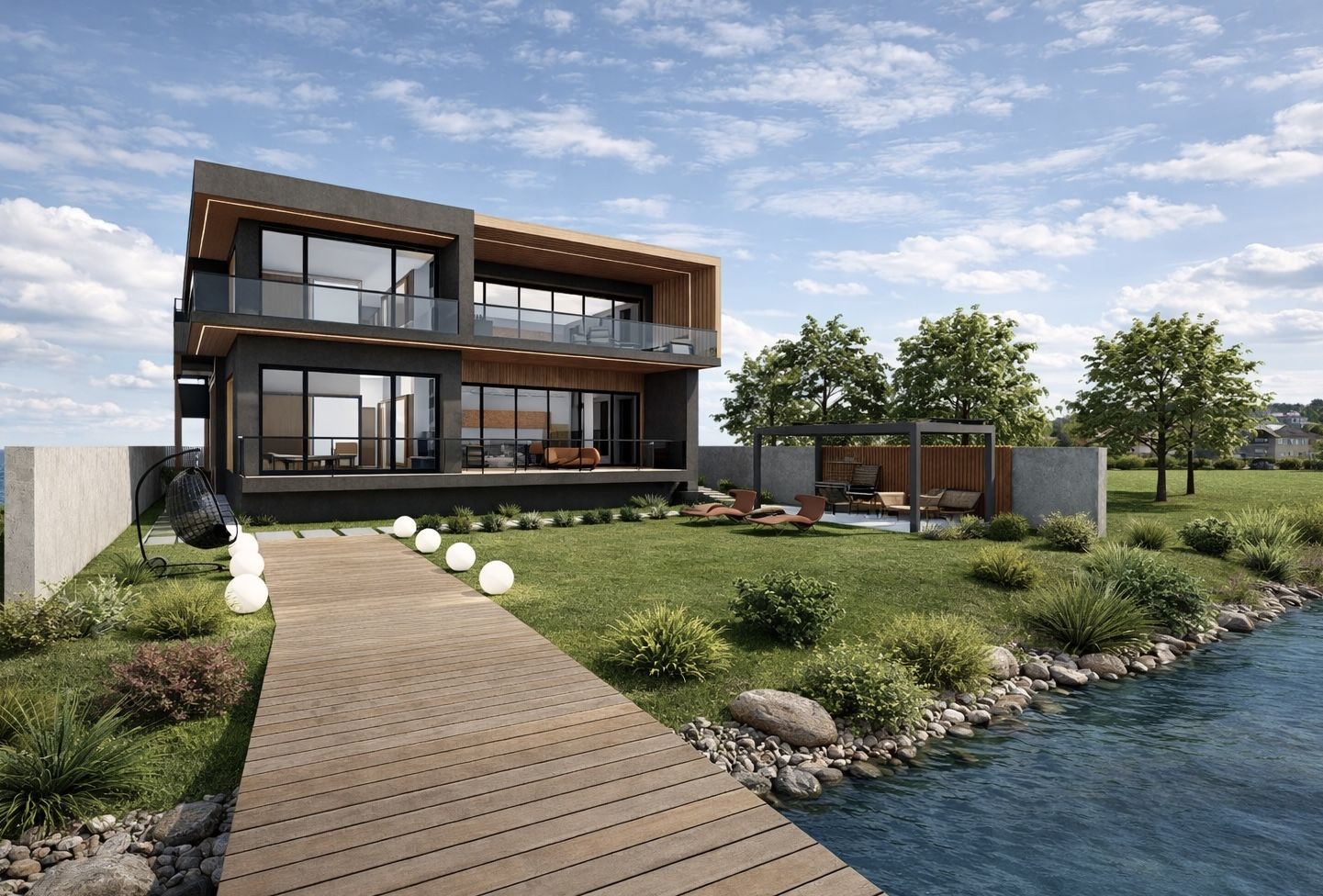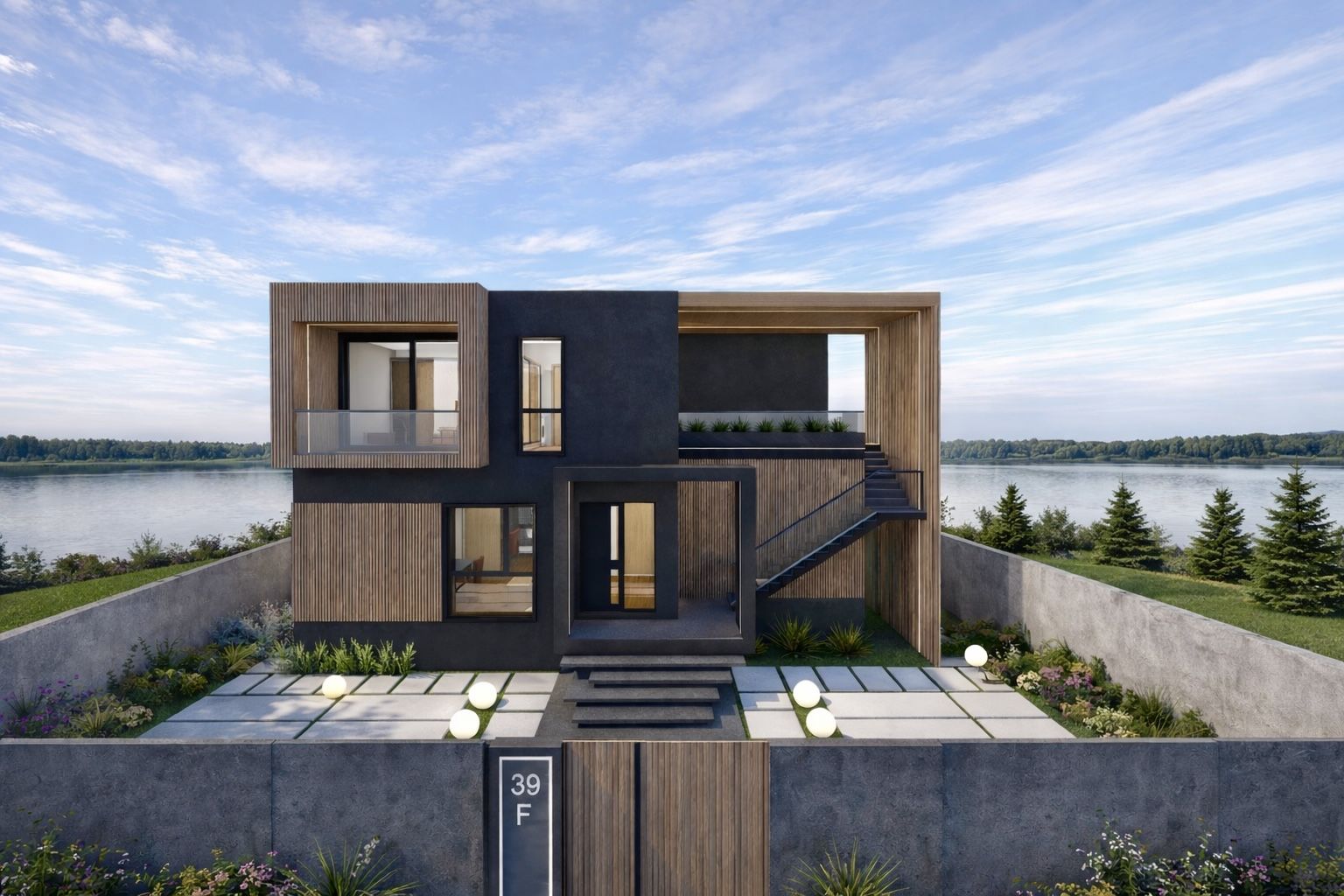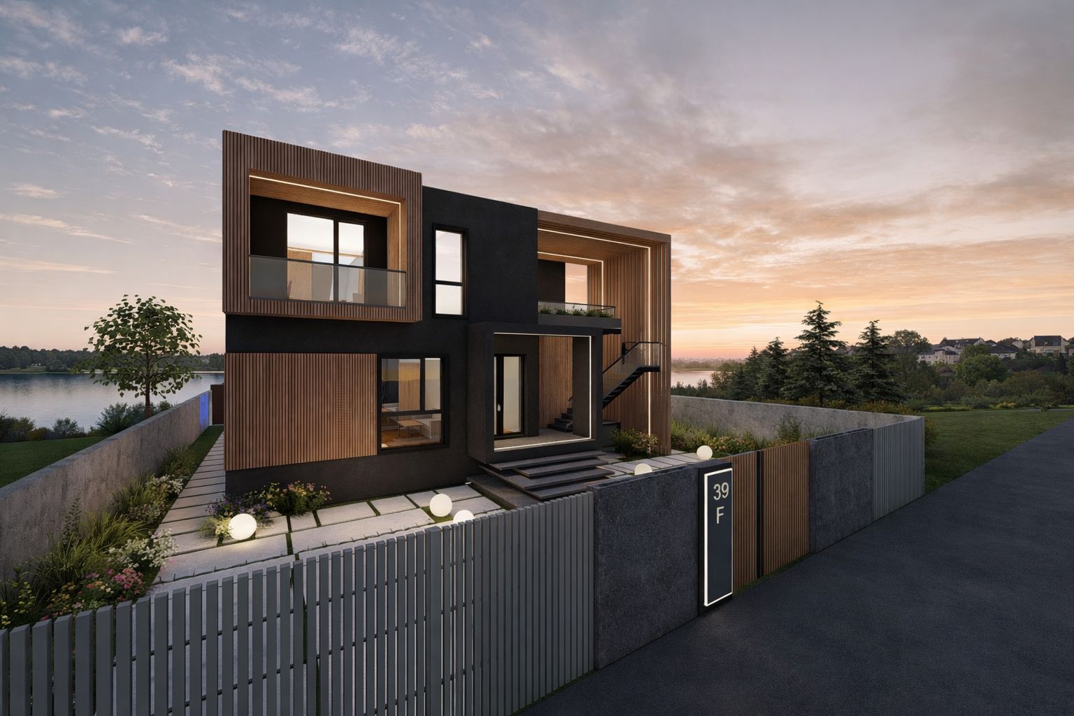 Acest tratament material creează un dialog coerent între suprafețele vitrate, terase și volumele pline, oferind clădirii o identitate distinctă și primitoare. Clădirea se află într-un dialog permanent cu natura și contextul înconjurător, prin intermediul teraselor și al grădinii cu deschidere directă către lac, în care proprietarii își pot amenaja un foișor de vară, ca punct de relaxare în mijlocul naturii, sau pot crea un mic ponton către lac.