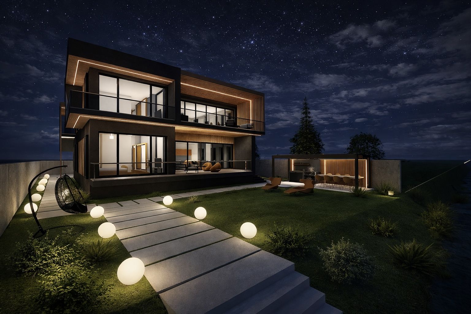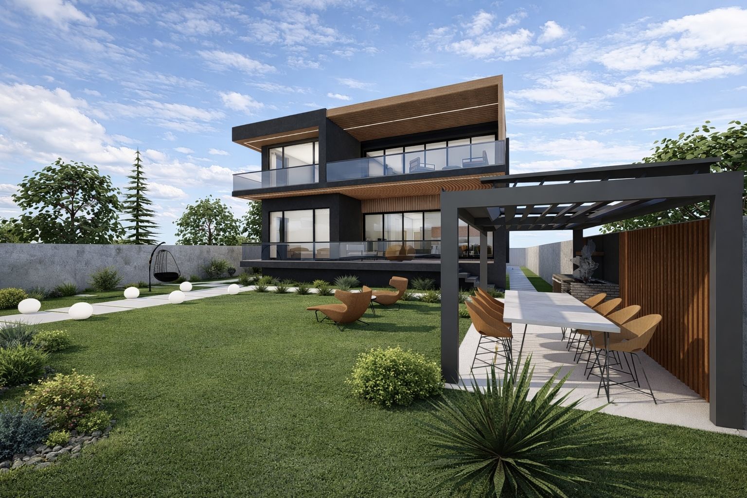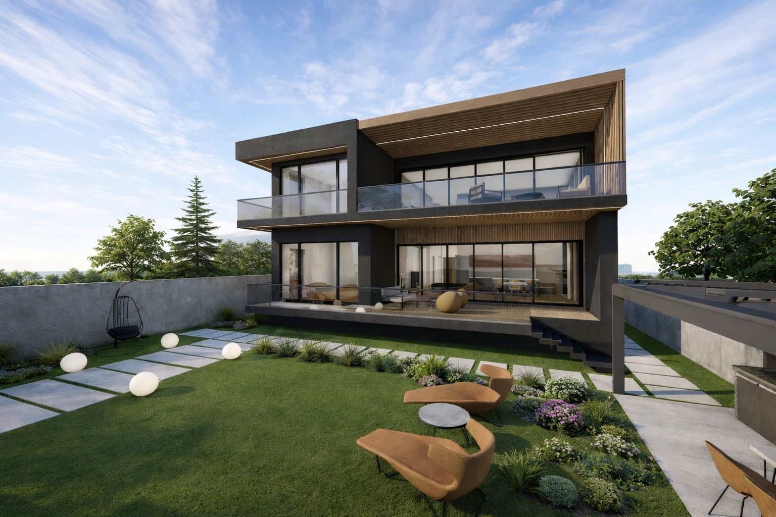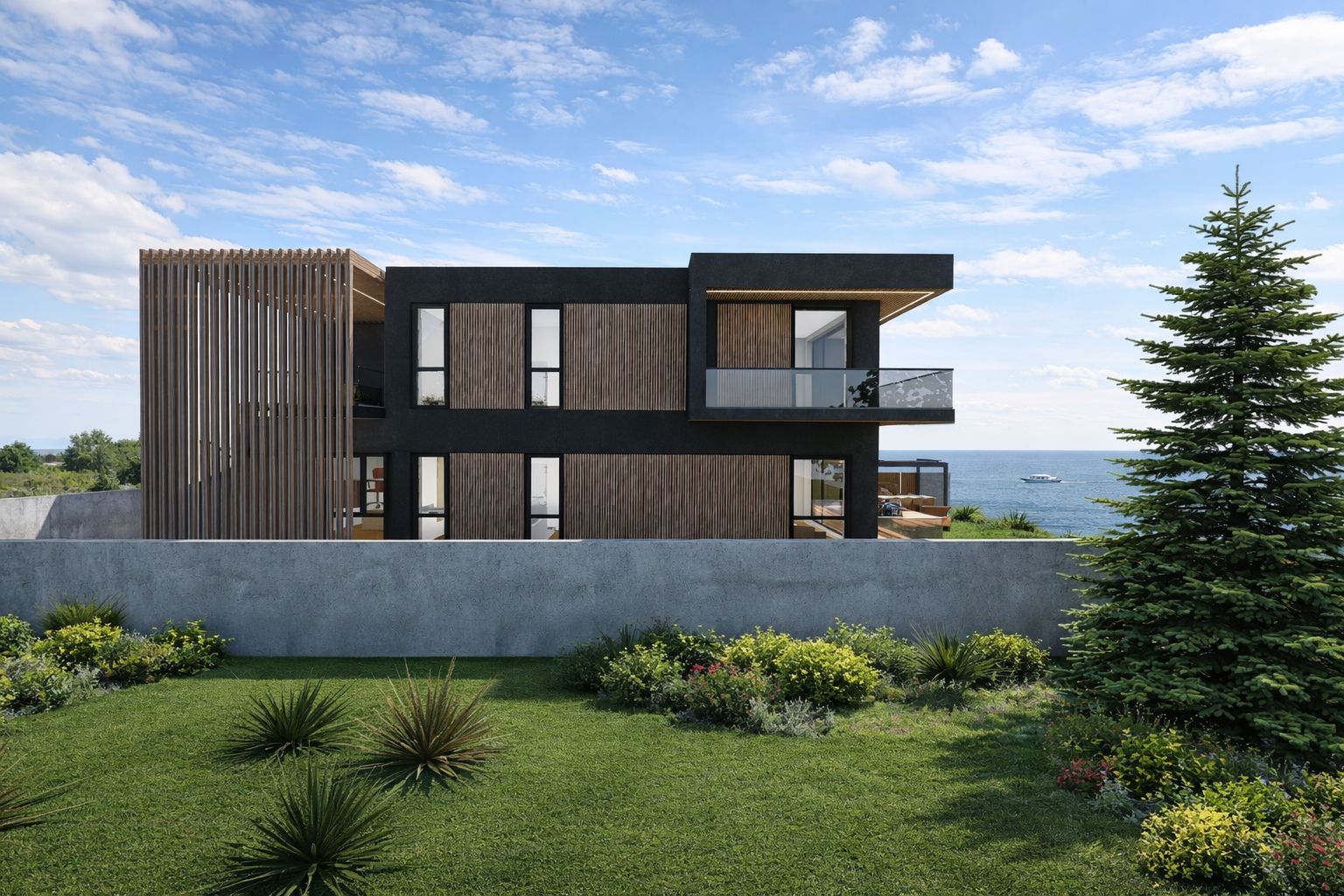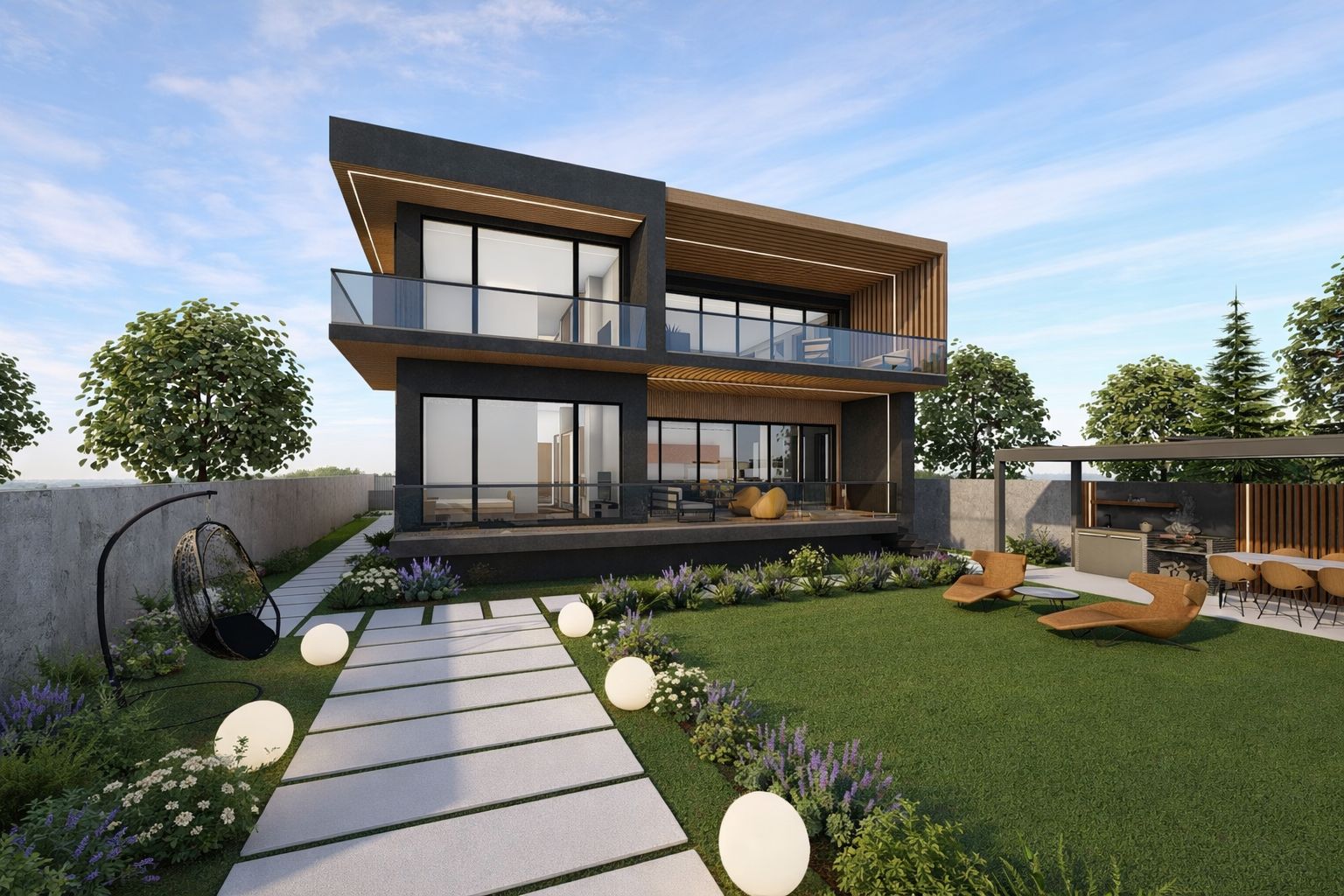 Acest tratament material creează un dialog coerent între suprafețele vitrate, terase și volumele pline, oferind clădirii o identitate distinctă și primitoare. Clădirea se află într-un dialog permanent cu natura și contextul înconjurător, prin intermediul teraselor și al grădinii cu deschidere directă către lac, în care proprietarii își pot amenaja un foișor de vară, ca punct de relaxare în mijlocul naturii, sau pot crea un mic ponton către lac.