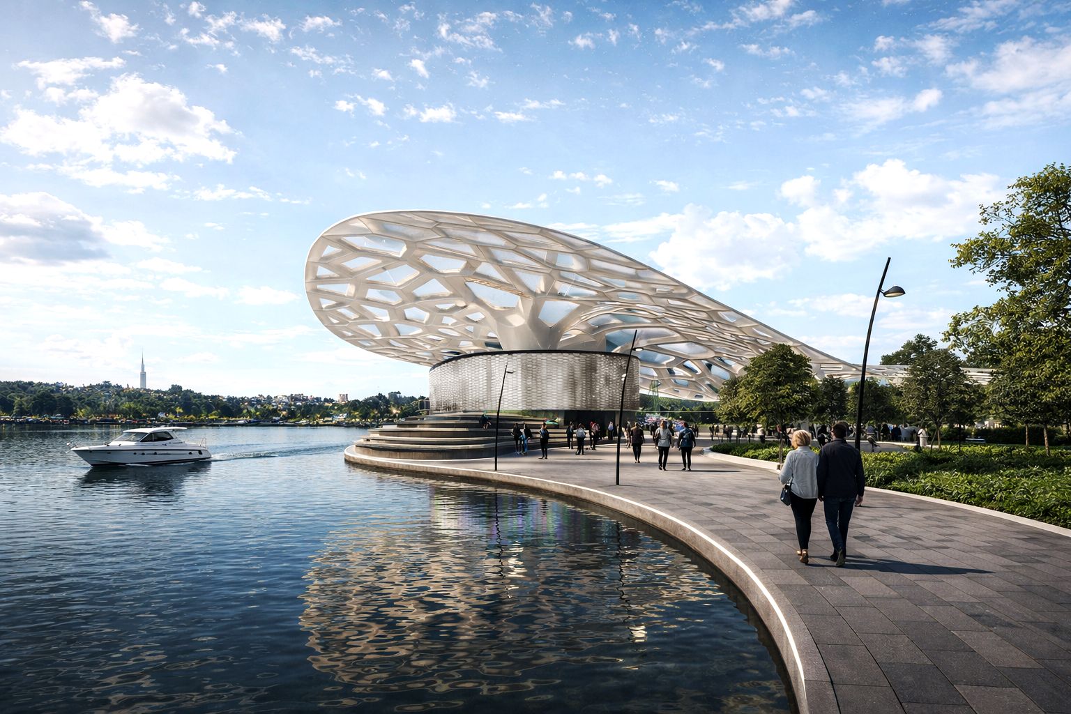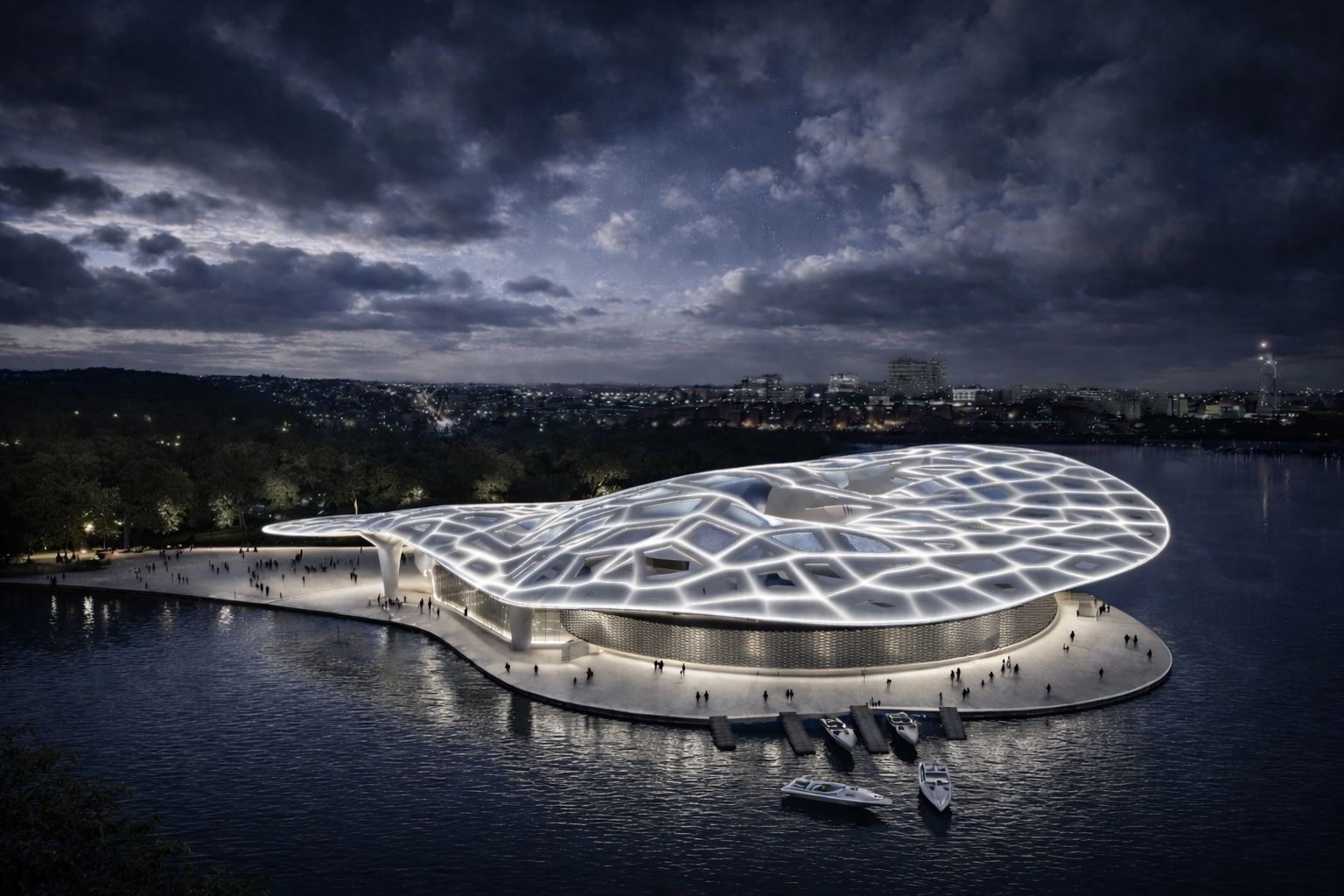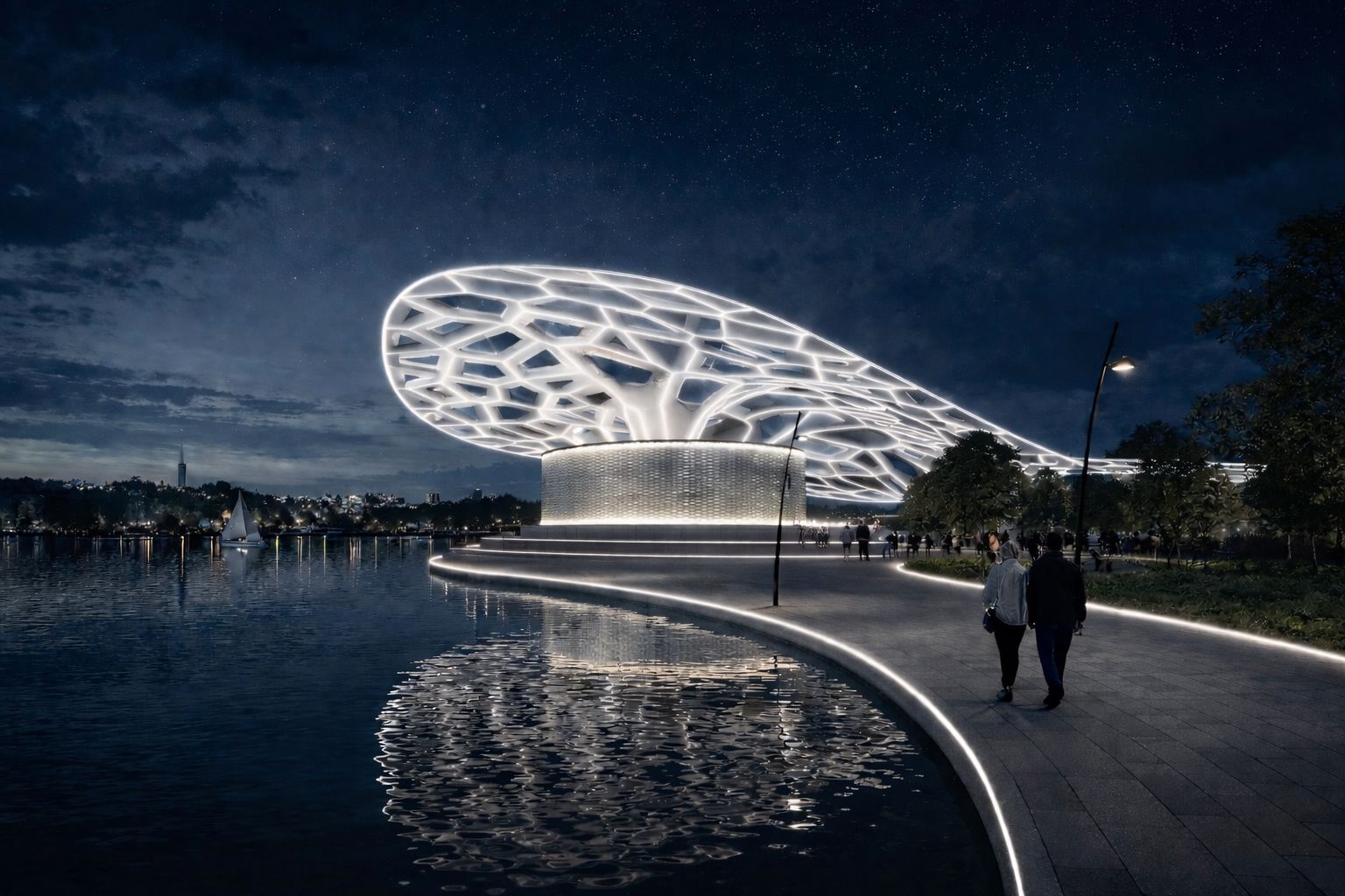 Arhitectura muzeului este concepută ca o expresie a inovației, cercetării și evoluției tehnologice, materializată într-o formă fluidă, organică, care pare să plutească deasupra apei. Acoperișul sculptural, cu structură parametrică, funcționează atât ca element iconic, cât și ca filtru de lumină, creând o relație dinamică între spațiile interioare și mediul exterior.