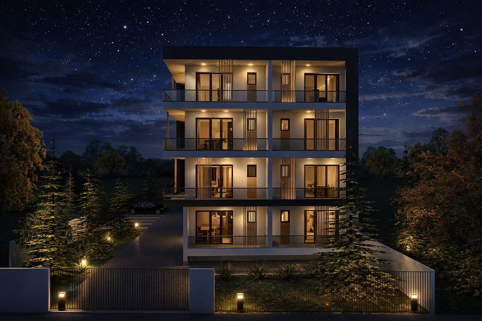 La nivelul fațadelor sud și est, riflajele decorative din lemn, dispuse alternant, adaugă un plus de căldură vizuală și contribuie la echilibrarea compoziției arhitecturale, armonizând întregul ansamblu cu specificul zonei de litoral. Acest tratament material creează un dialog coerent între suprafețele vitrate, terase și volumele pline, oferind clădirii o identitate distinctă și primitoare.